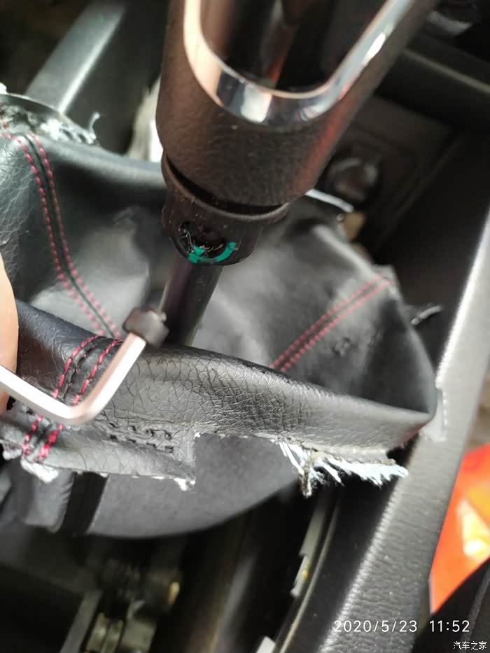 只好先装好原来个旧的防尘套,去保养时找师傅整。或者将新的防法套顶部的线拆开套入档杆头再手工缝上线。这个要我老婆得闲才能做还要找合适的线。