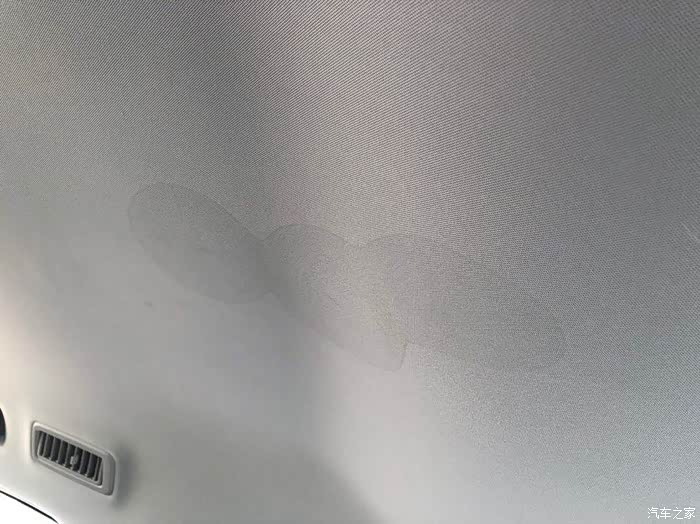 一开始是有两道黑色的脏东西,估计是小孩手脏摸了顶棚,我以前骐达顶棚是那种绒的,用泡沫清洁剂擦得干净。于是这车我也一样用泡沫清洁剂擦了,刚擦完发现干净了,但是第二天干了以后,发现悲剧了……一块水渍……于是我又擦了一次,第二天,水渍变大了……然后我以为是泡沫清洁剂的问题,就买了纯净水又擦了一遍,变成一圈了……再擦一遍……圈更大了……
