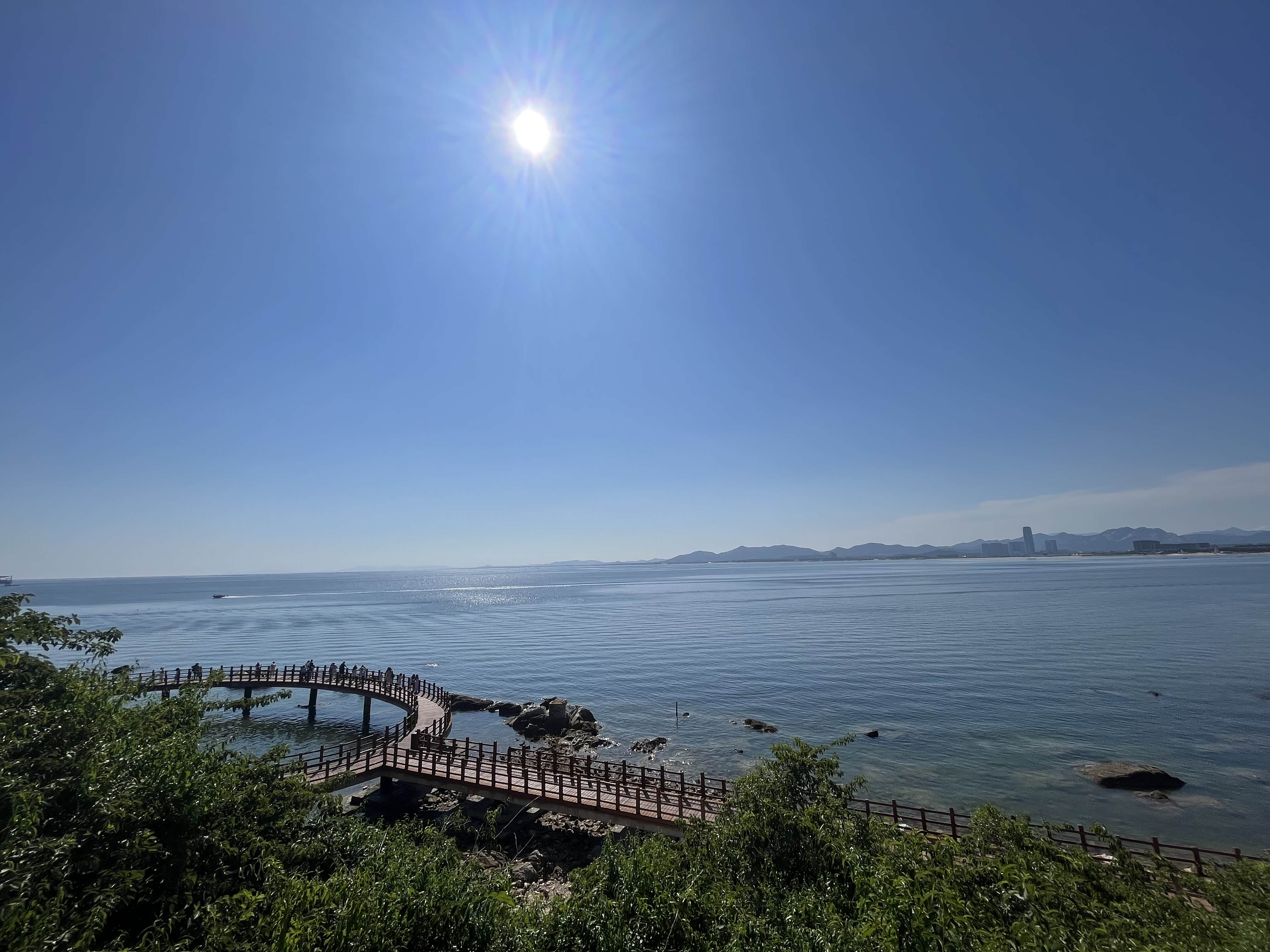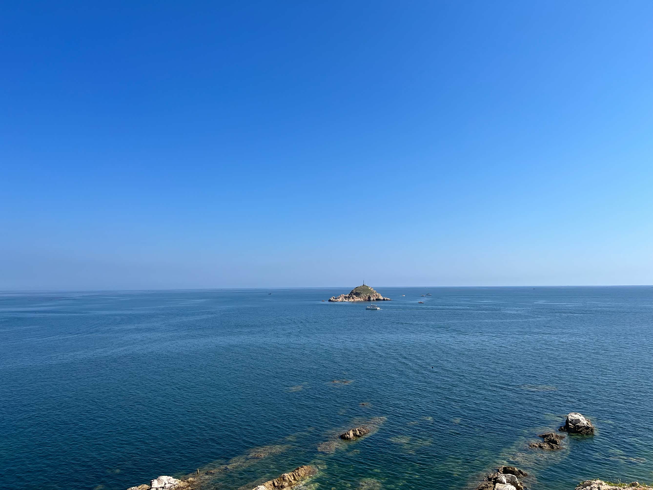 在崂山顶俯瞰黄海,波光粼粼的海面与蜿蜒的海岸线构成一幅壮阔画卷。这里提醒未来前往的自驾者:崂山部分路段较窄,旺季时最好错峰出行。