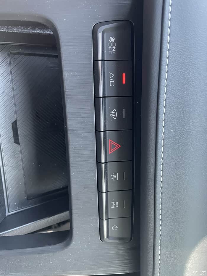 这个是中控大屏下面的按钮,也是非常方便,从左到右依次是空调控制器,玻璃除雾,路边临时停车,也就是我们常说的双闪,在右侧则是新手非常喜欢的360度雷达影像,最右侧是中控大屏的开关控制器