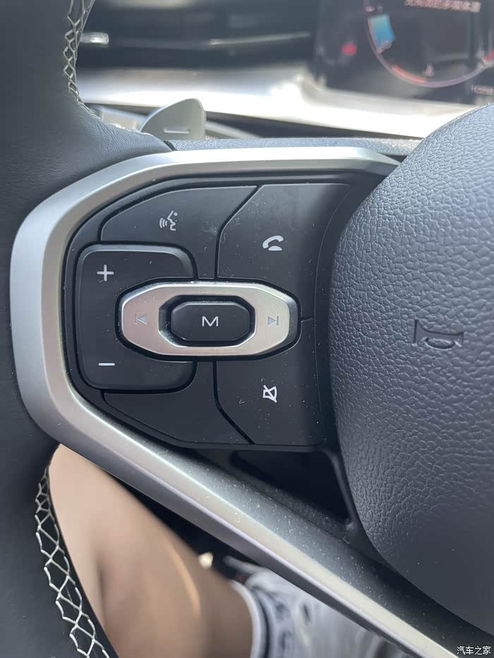方向盘的多功能按键,左边的+?是音量键,M键是音乐暂停播放案件,M右上角的是电话接听,左上角是语音识别