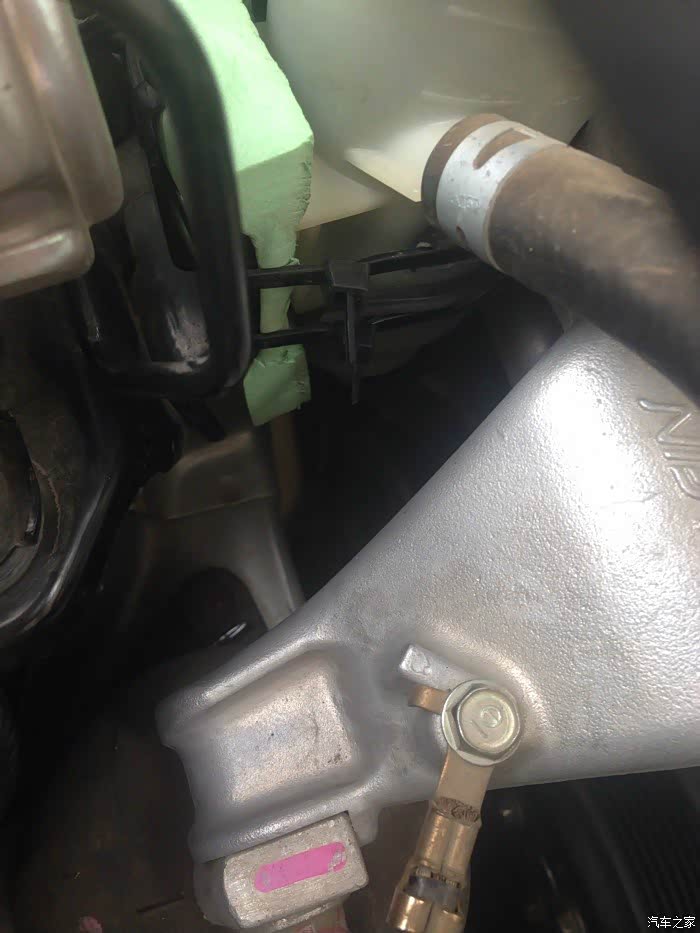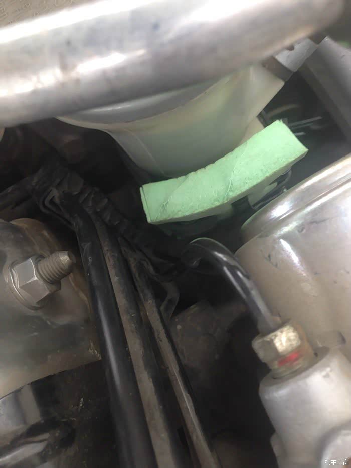 在论坛上看到不少车友采用油壶减震法解决八代雅阁2.0助力泵异响问题,开始也有怀疑是否有效,近日有空就试一试,想不到真的有效,能减少80%噪声,终于找到新车时的感觉。其实办法很简单,就是把油壶拉出来,垫一块海绵之类的减震材料,然后固定好,目的就是让油管振动不要直接传到车体引起共振。我在论坛“不淡定的雅阁”的帖子看到有2.4的油壶减震改装支架,但其不适用2.0车型,2.0车型油壶所处位置相当小,原支架不好拆,支架难以改装,如果有车友能做出如“不淡定的雅阁”的产品,肯定热销。下面借用其他车友图片让大家了解油壶减震法的安装。