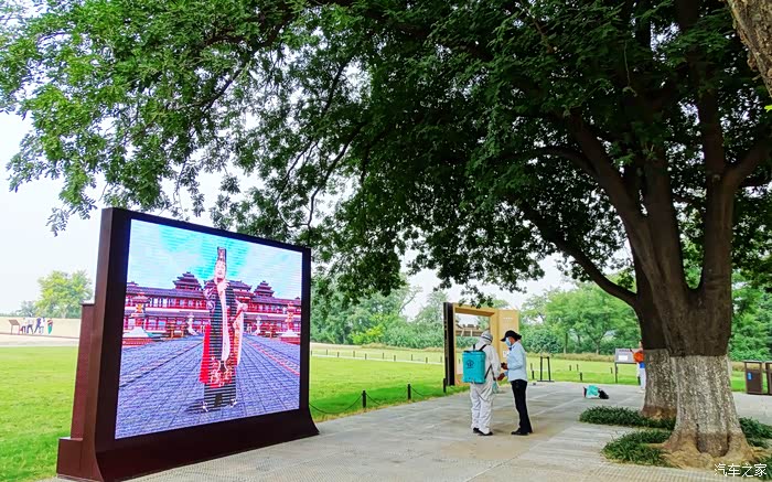 前殿遗址前的古树下,显示屏循环播放宣传视频。