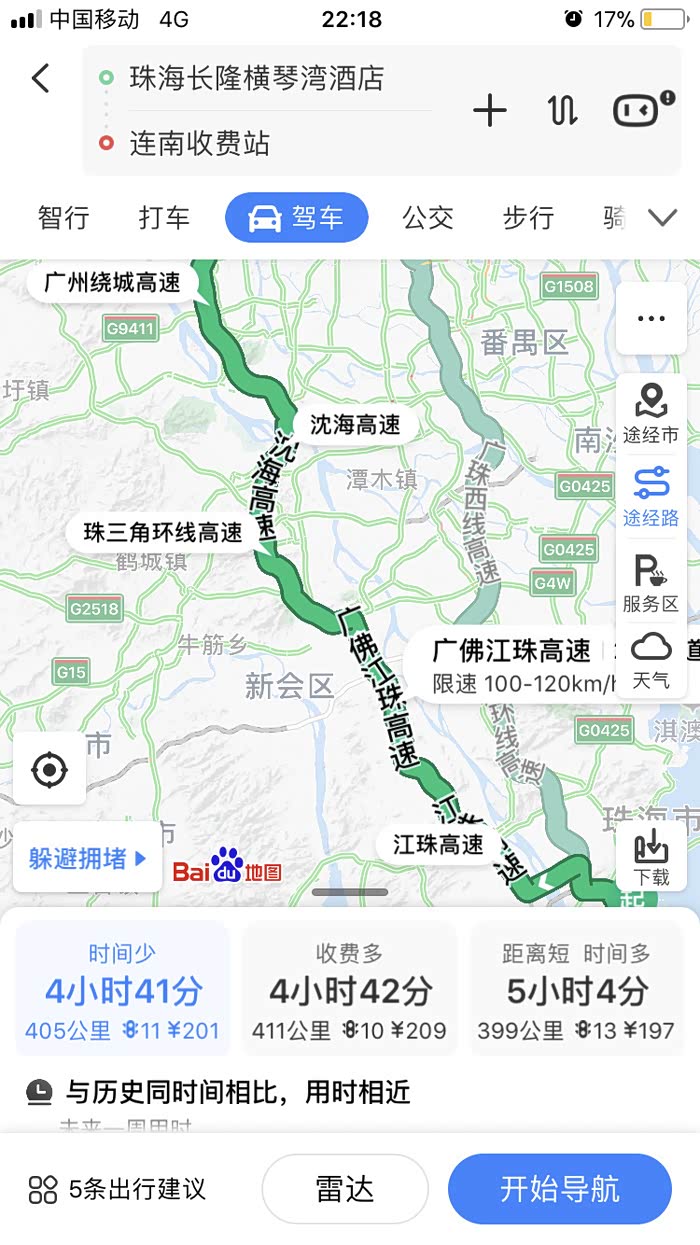 下下周计划从珠海横琴湾酒店开车回湖南长沙,不想再过广州市区,所以不打算走乐广、京港澳以及武深、最主要是走乐广要经过广州市区,特别是机场高速那段,京港澳货车太多,武深收费贵限速低。我计划的路线如下:
