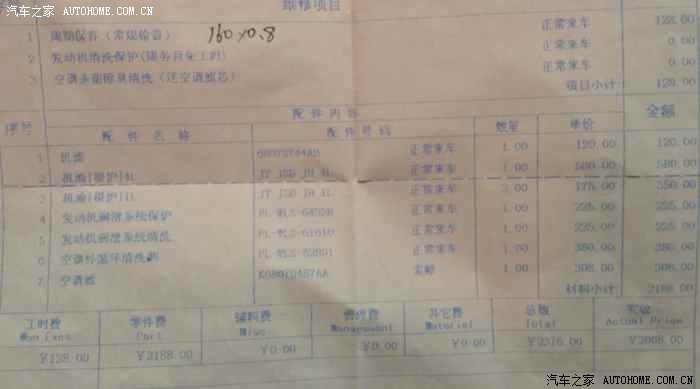 昨天5000公里周期保养,除了更换机油、机滤外,还更换了空调滤芯,清洗了发动机,一共花费2000多。机油用的嘉时多极护6升,930.00元;机滤120.00元;空调滤芯308.00元;另有因更换全合成机油需清洗发动机而使用的威力狮发动机清洗剂、保护剂各1瓶,共450.00元;工时160.00元。