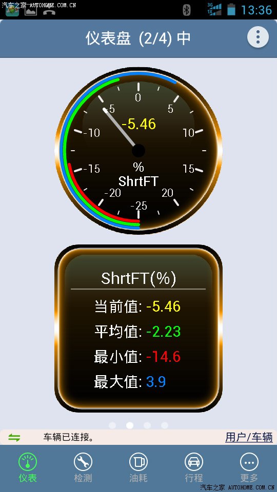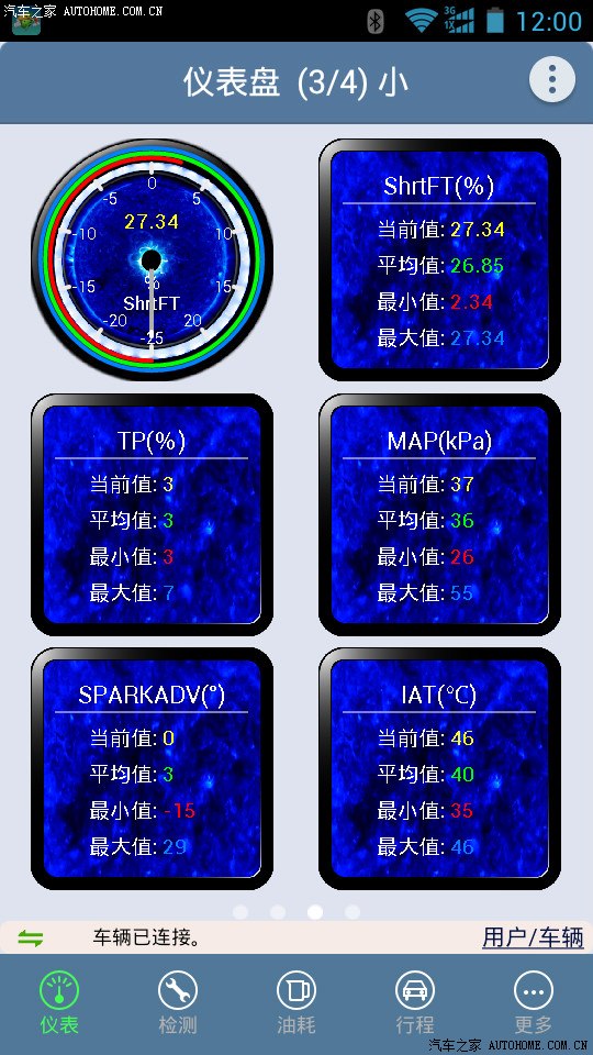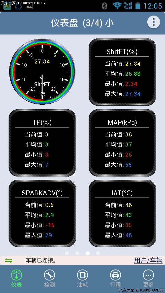 第一次打火:一次点火成功,发动机抖动厉害,等热一会车后,温度趋于正常后,转速下降到正常的750左右,怠速稳定;发动机没有任何故障码,心里窃喜,用车载OBD查看燃油修正,瞬间修正大道+27.34,当时都吓蒙了,太大了,都爆表了(表针显示-25%~+25% 之间),于是开始思索哪里出问题了。