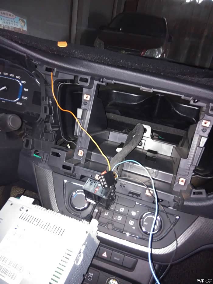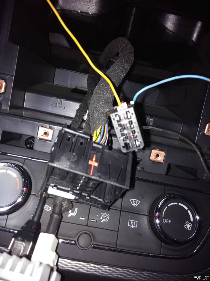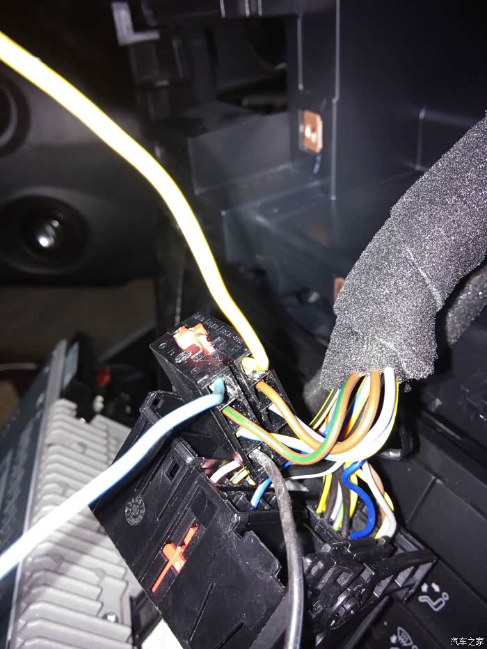 好了,至此前门完成,前门还是比较容易做的,只需要换下喇叭,不需要接线,前门另一扇门做完后我们就开始做后门,后门原车没有预留线束(这点鄙视一下上汽,太小气,不安装喇叭把线给埋上也行啊)所以需要从中控引线到后门,由于没拍接线图详细图片,所以借用论坛大神:陶蕴轩瓷坊 的一些图片,深表感谢!拆中控的时候下面就是空调控制按钮下面的那一长条也得撬下,里面有螺丝!