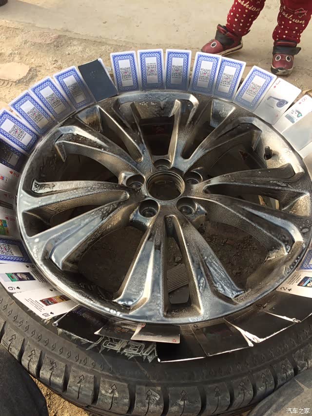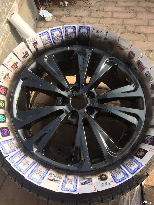 这个也一样,先用扑克牌延轮胎一圈插好,以免影响效果,一次不要喷太多,喷多了会滴下来,有气泡,第一次撒一圈就好了,接下来,就是等了…