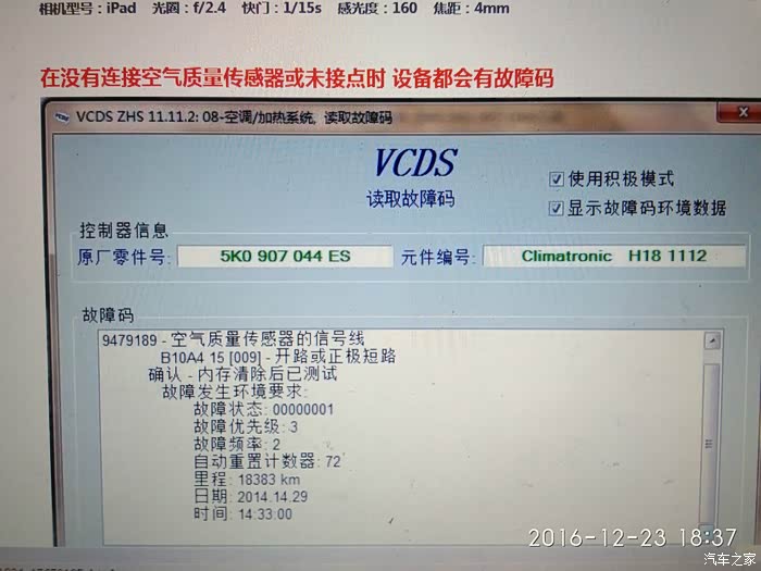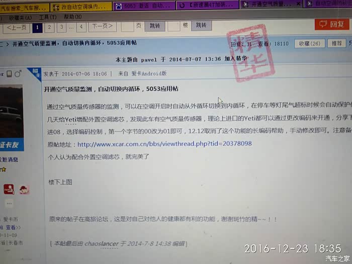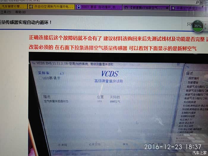 把车子拆开的部分还原后,立即驾车出了小区,直奔大货最几条路,跟车测试。为了观察自动切换状态,自己一直接着5053和笔记本,在前方有货车情况下,空气传感器值立即变化,表明风门已自动切换,车内一点怪味都没有,至此,自己的一块心病终于了却,代价就是寒风中一整天的劳累和随后几天严重感冒带来的擦鼻涕擦掉几盒纸巾和几十元的感冒药