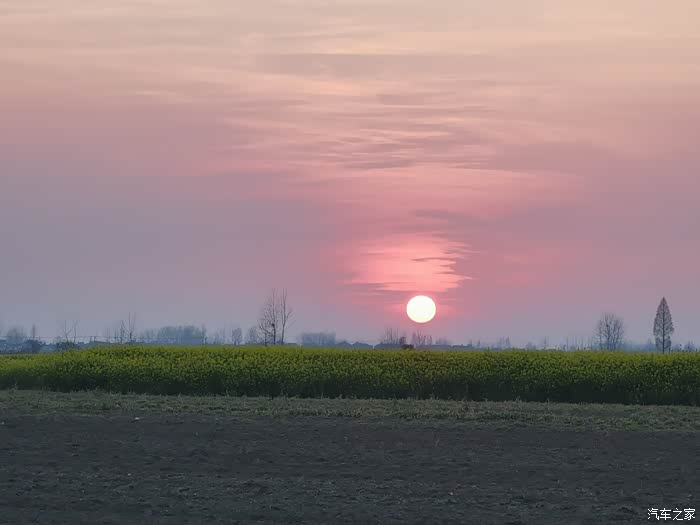 成片金灿灿的油菜花与红通通的夕阳交相呼应,美如画