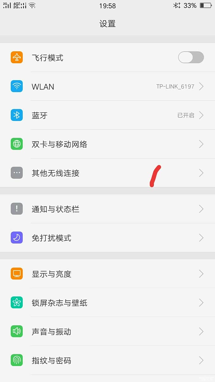 打开手机中的设置。找到其他无线连接,并打开。