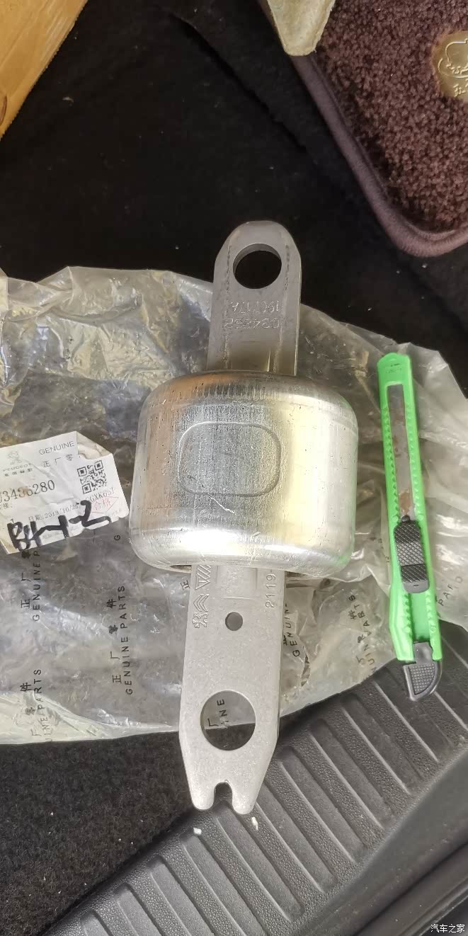 第二个问题,怠速抖动。我自己有Diagbox,看数据流故障码都正常,只有一种可能,发动机脚老化。打开机盖,副驾机脚那个位置不好看,不过用手一模,已经塌陷一个小手指厚度。拆开一看,7万多公里,机脚彻底完蛋,彻底塌陷到最低位置。