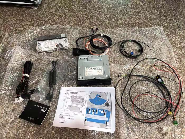 全家福(766主机、二代倒影、7寸屏幕、蓝牙麦克风、carplay插头)。特别注意,我只需要用前插头,所以买的大众的,后来卖家给我发了个后插头,没关系,从绿色插头分离出红黑两条线,下面会讲!
