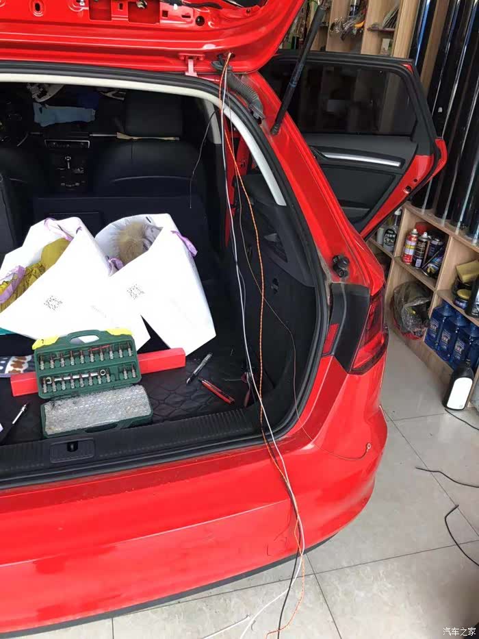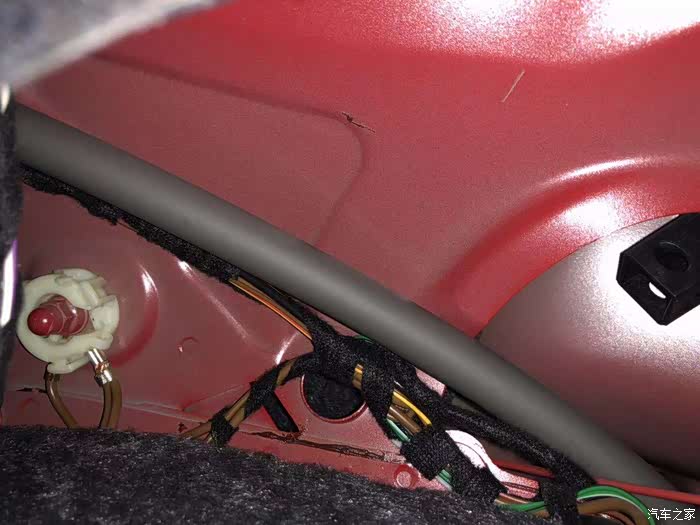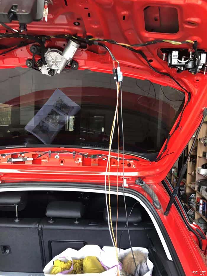 扒光后备箱饰板,拆下副厂摄像头,抽出线束,注意:右下皮胶套那留着,做引线,原厂线布进去就省力了!