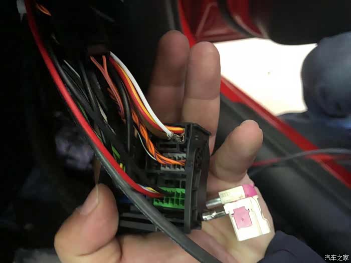 来了老弟!最关键一部,后面接线,这里有2个点我参考的车友帖子里讲的不是很清楚。1.can线(也就是黄色两根线),他的接法为退出原米色插头内的线,插到买来的插头上,花色对应,插头下方多的2根线插回拔出的孔位内,建议一根根的弄,因为颜色差别真的挺小的。2.电源线该如何接,逛遍论坛有2种接法,一种是接一根电线去保险盒acc取电,还有就是主机电源线破线取电或退针缠上去再插进去取电,这两种方法都需要把倒车影像电源线针头剪掉。