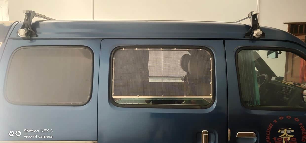 自己做的防蚊窗纱车上睡觉有通风又安全,卡在玻璃槽里稳稳的,行李架上有车载水箱和车顶帐篷图片传不上来。