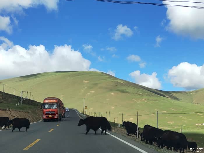 进入藏区随处可见的牦牛 经过公路 小心行驶停车禁鸣喇叭