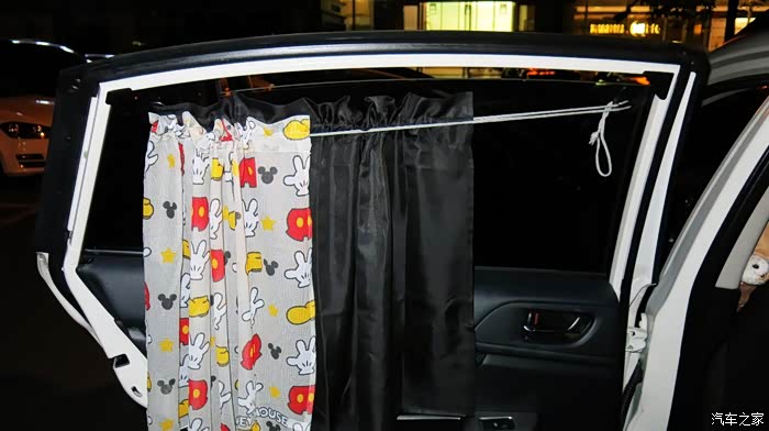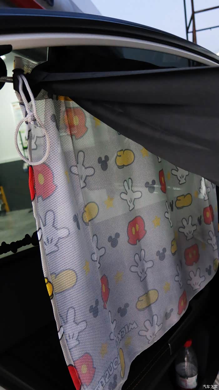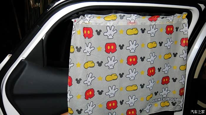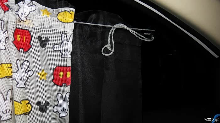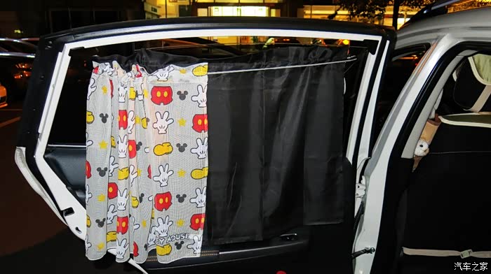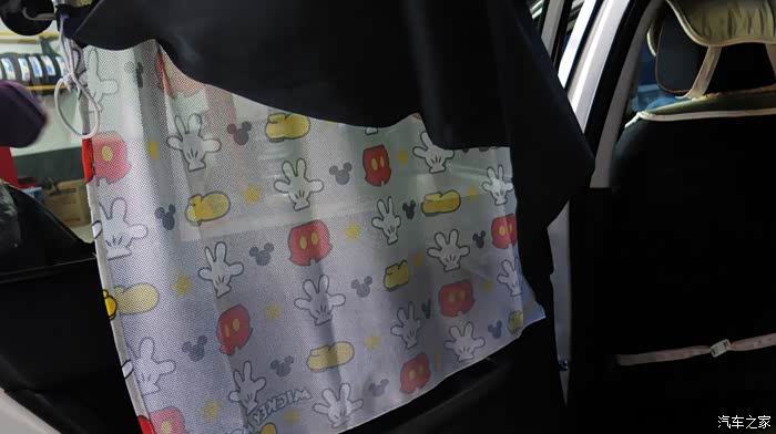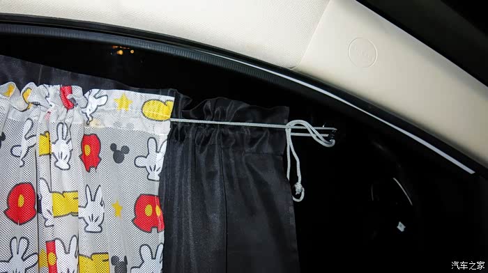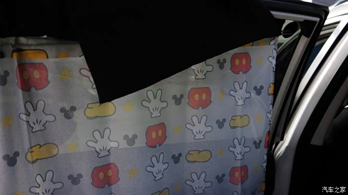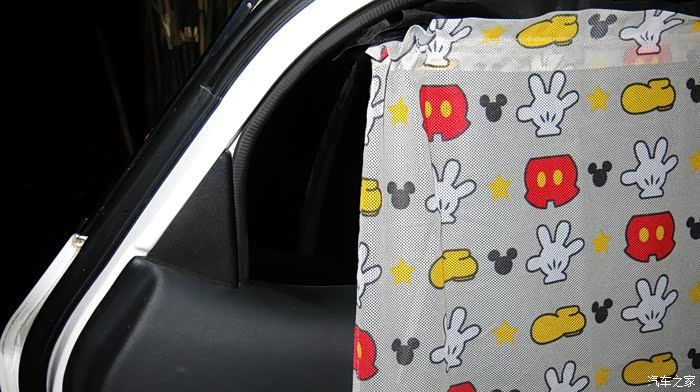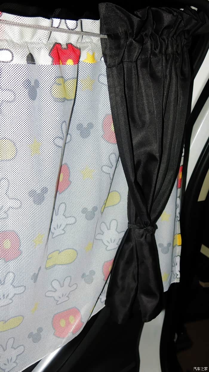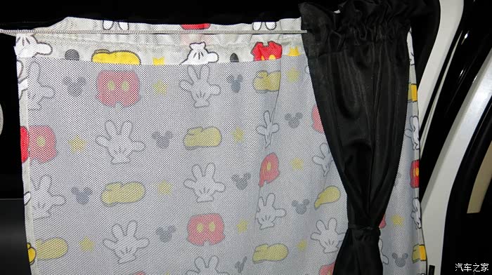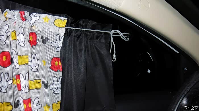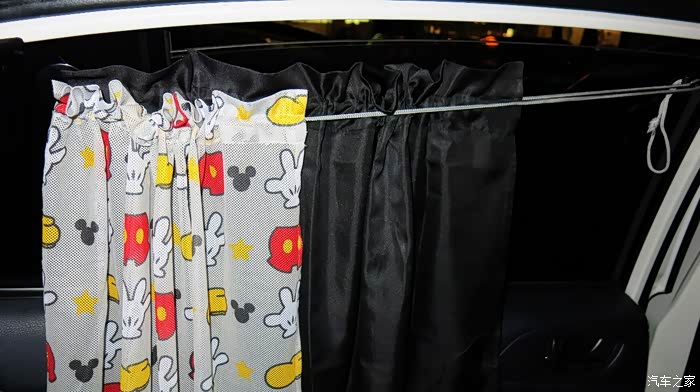 我认为把黑色的窗帘放在外面,让车外人感觉有鬼似的,车里人也感觉黑洞洞的。所以我尝试着把黑色的窗帘放在里面,让外面看见的是印花,米奇图案,看起来比较自然。