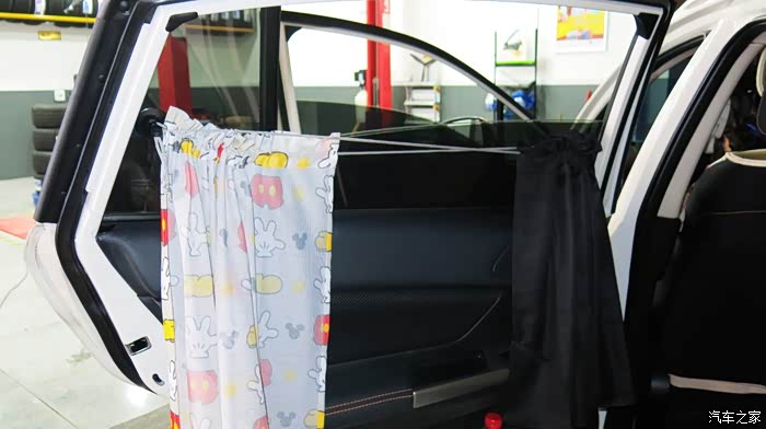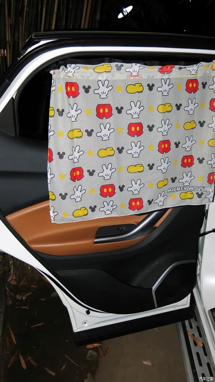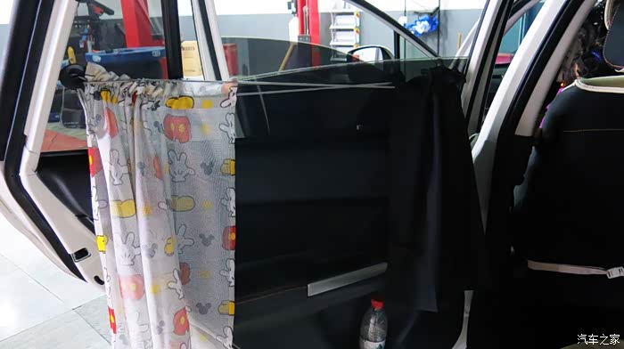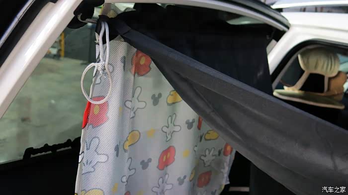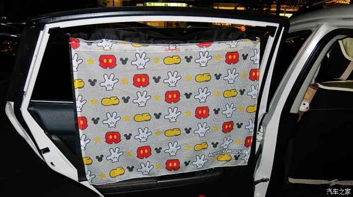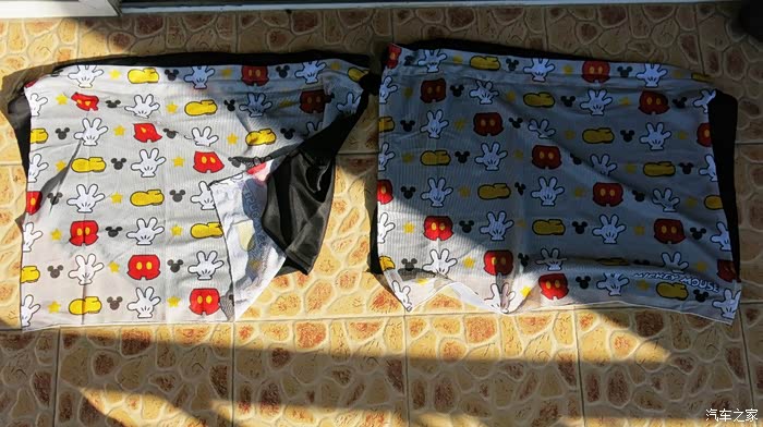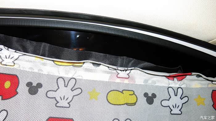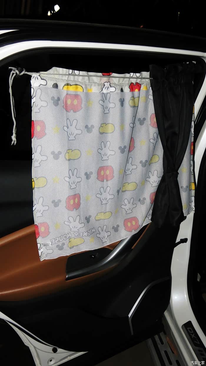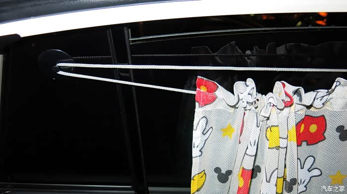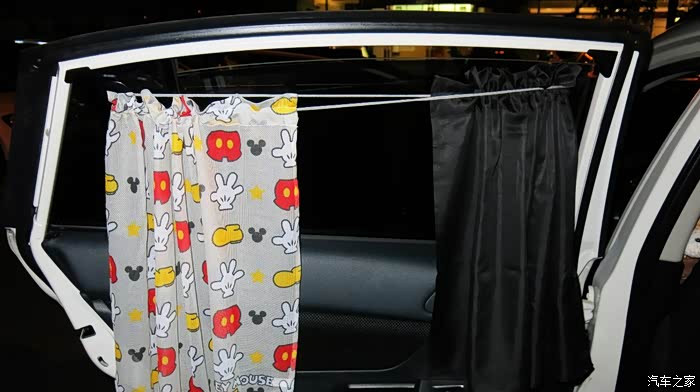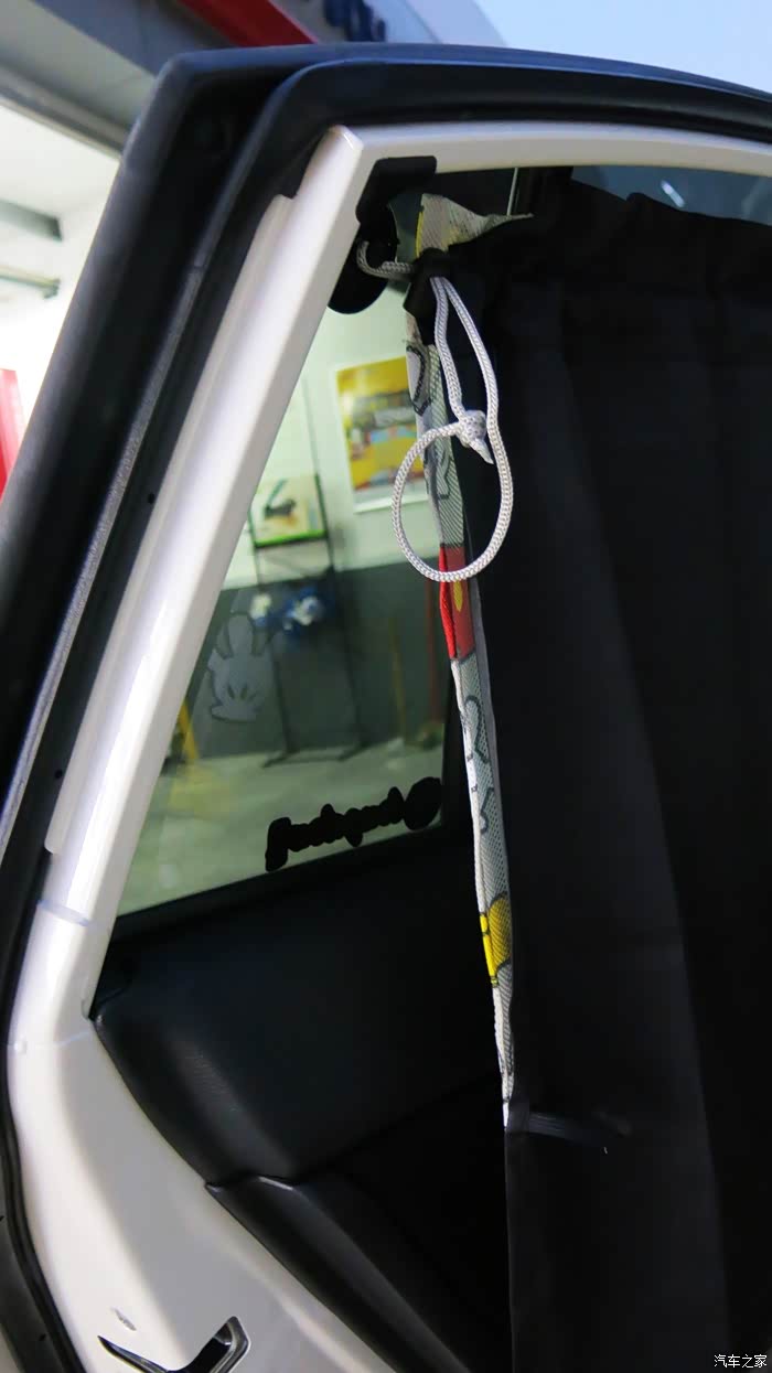 我认为把黑色的窗帘放在外面,让车外人感觉有鬼似的,车里人也感觉黑洞洞的。所以我尝试着把黑色的窗帘放在里面,让外面看见的是印花,米奇图案,看起来比较自然。