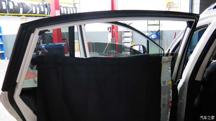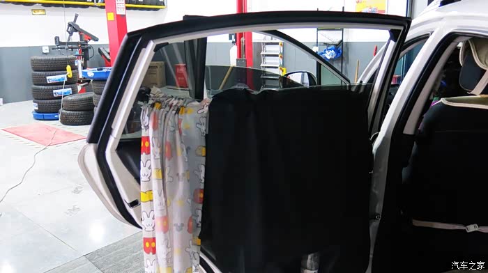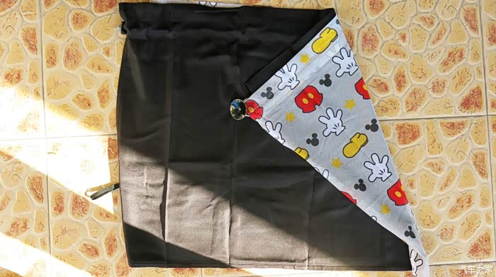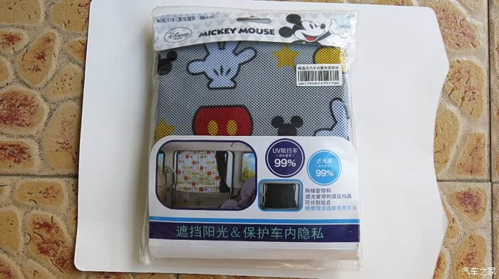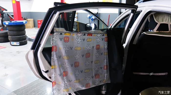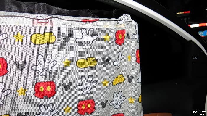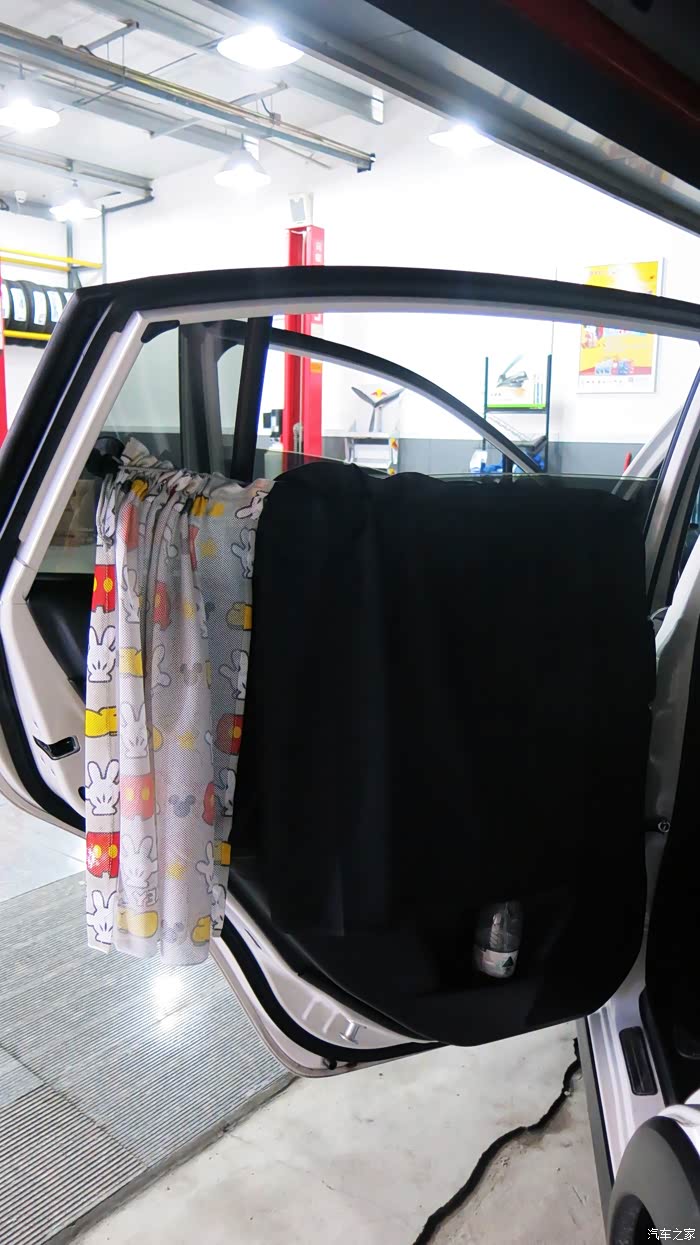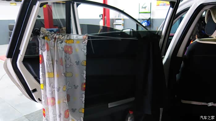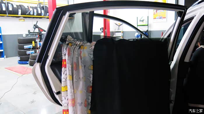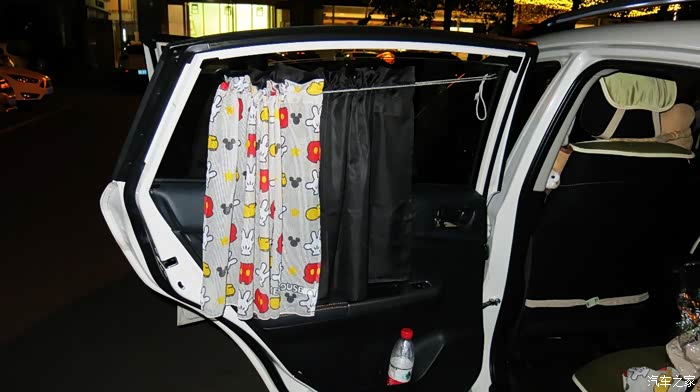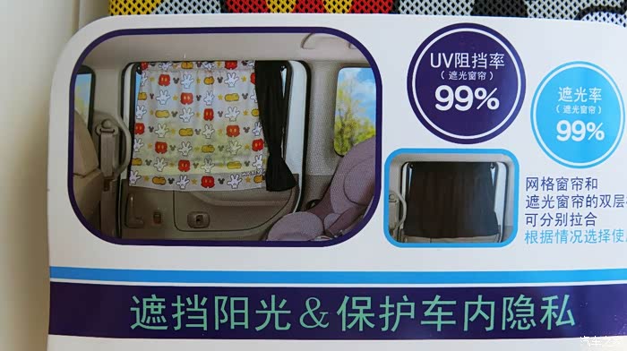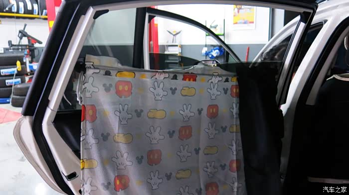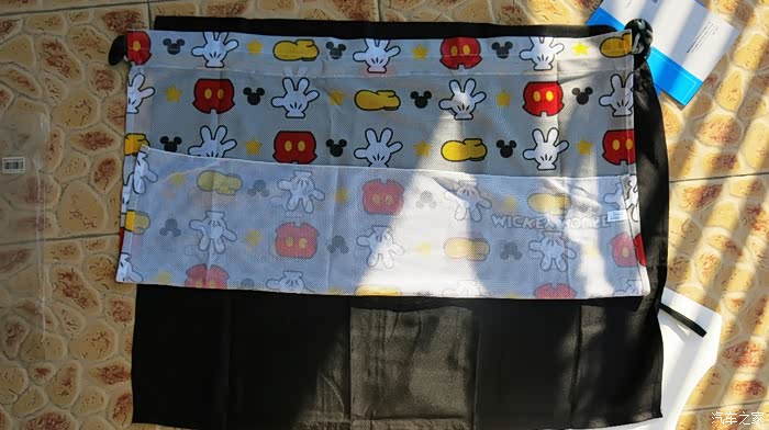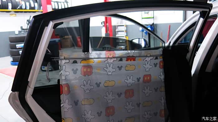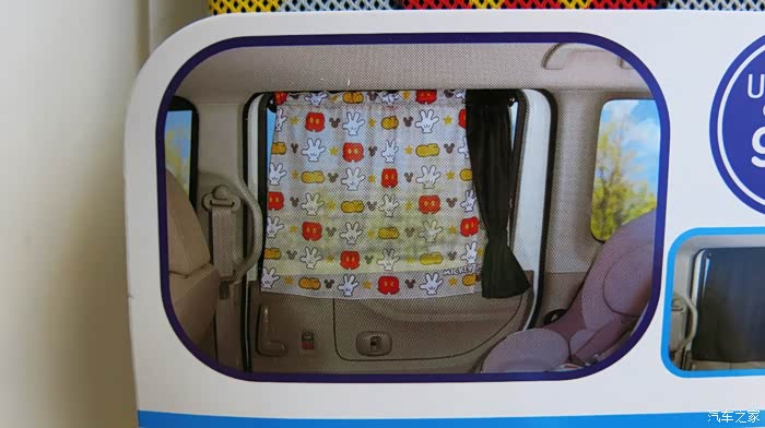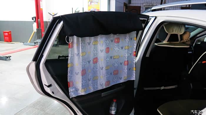 我认为把黑色的窗帘放在外面,让车外人感觉有鬼似的,车里人也感觉黑洞洞的。所以我尝试着把黑色的窗帘放在里面,让外面看见的是印花,米奇图案,看起来比较自然。