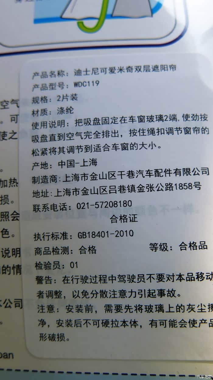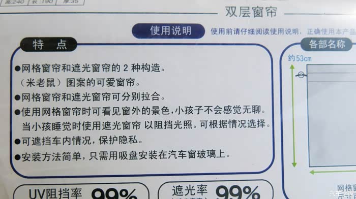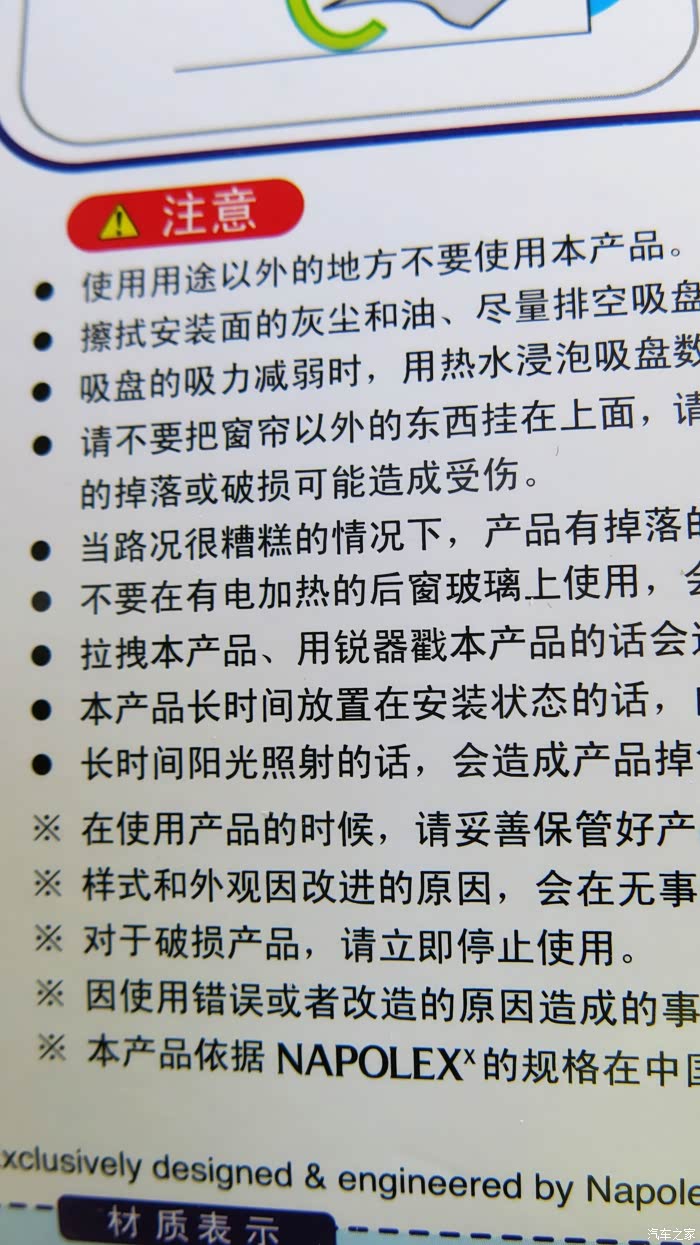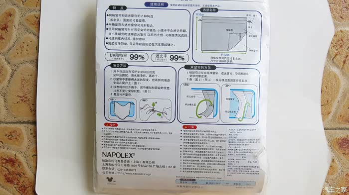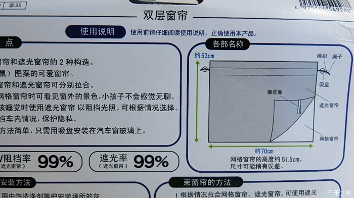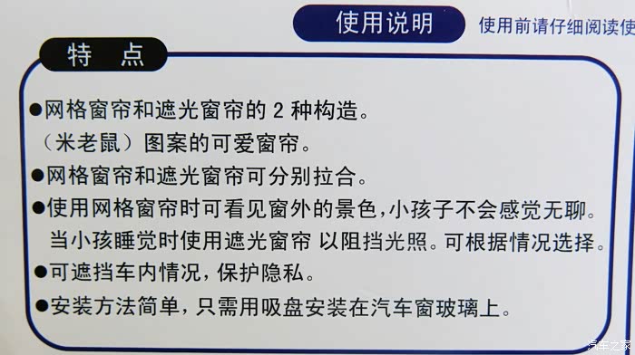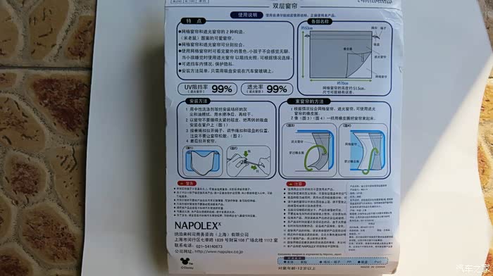 3,窗帘的包装上面就是说明书,包含的内容非常全面细致,如最生产厂家和销售厂家,安装方法,安装注意事项,而且特别强调了可能会出现危险和注意事项等等一些警示说明。特别提示了一些不正确的安装和使用方式可能会影响驾驶安全,会可能伤害儿童等等。