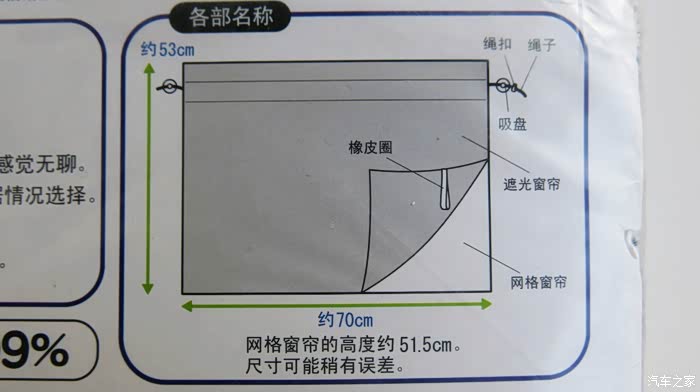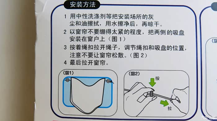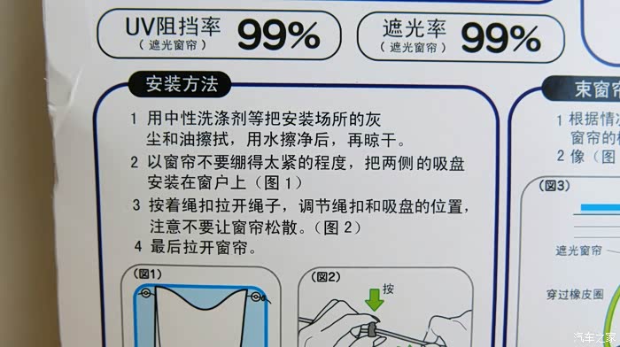 安装操作非常简单,只需固定吸盘,拉紧绳扣就可以了。我感觉这一款产品只适用于汽车的后排玻璃窗,说明书介绍说,安装在前排会遮挡视线影响驾驶,容易引发交通事故。我还是尝试着安装了前排实验了一下效果,在后面展示。