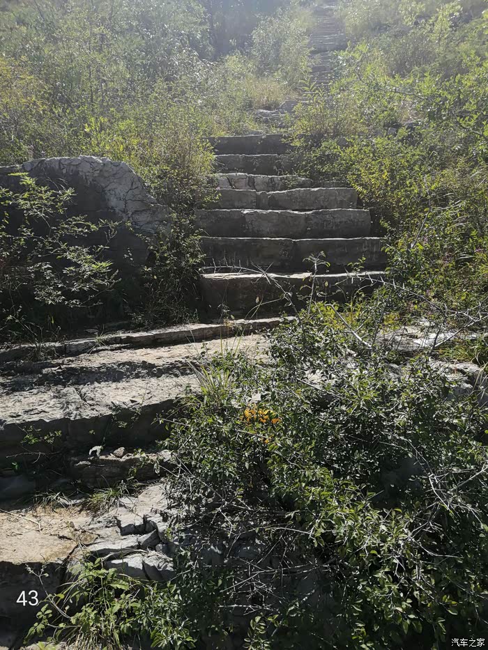 窄窄的路边辟一平地,能容四五辆车,空地边有石砌台阶蜿蜒而上,直通半山平地,因雨水破坏,路基多有坍塌,乱石挡道,土石零落,但有毛不算秃,有点台阶便于登山。