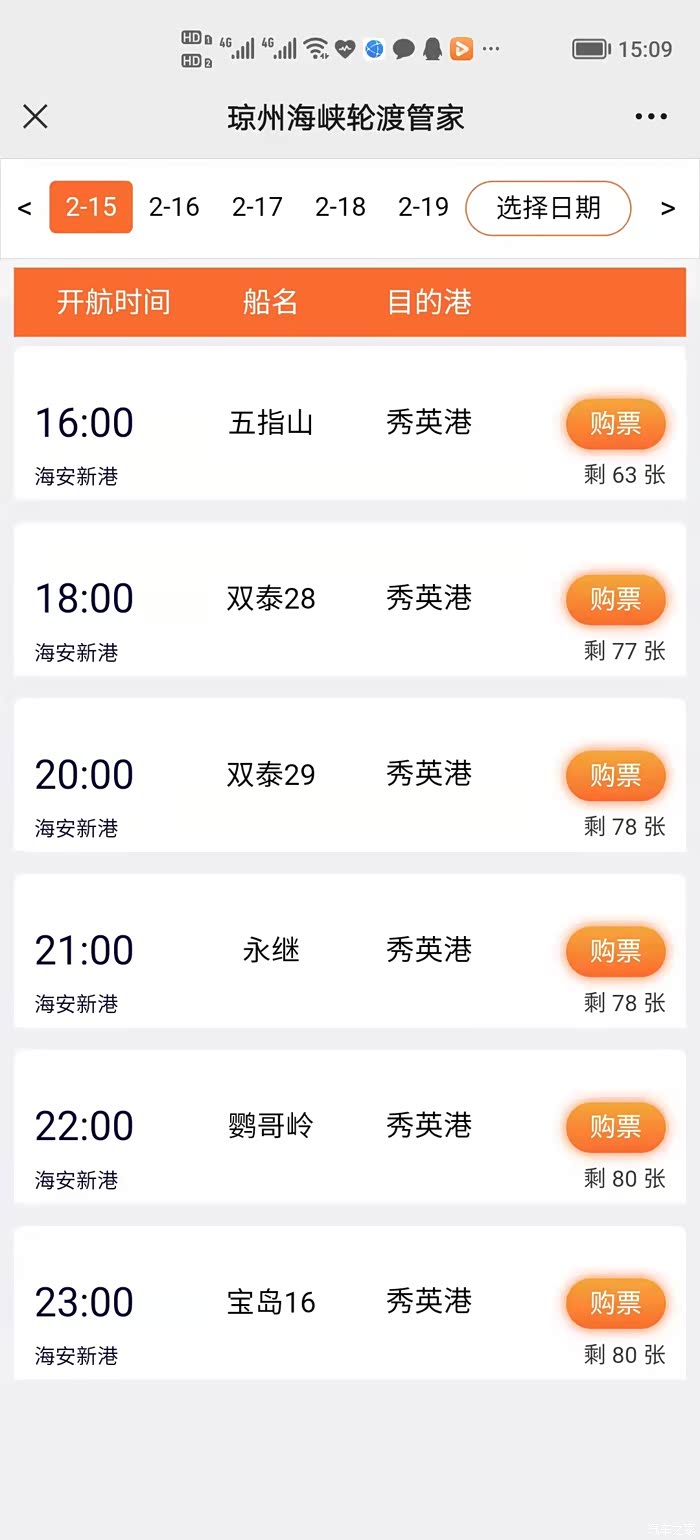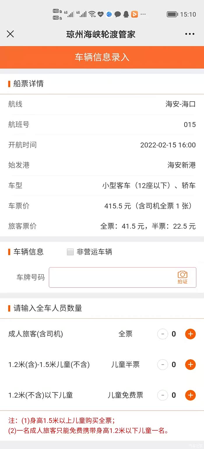 买票就不说?了,海安新港,徐闻港,海口港都有各自?的微信公众号,一张票带一个司机415元,其他乘客另算钱,41.5一个我记忆,也可以各自的微信号买对方?的港口票,这个没什么可说?,我觉得需要提?就?通过微信号查看船?排期装??少船来根据自己剩余里程数买几点?票以便节约时间很重要