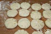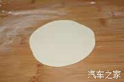 4、把面团切成小挤子,擀薄,包馅压扁;