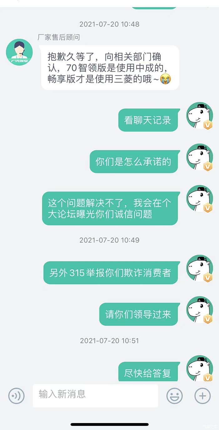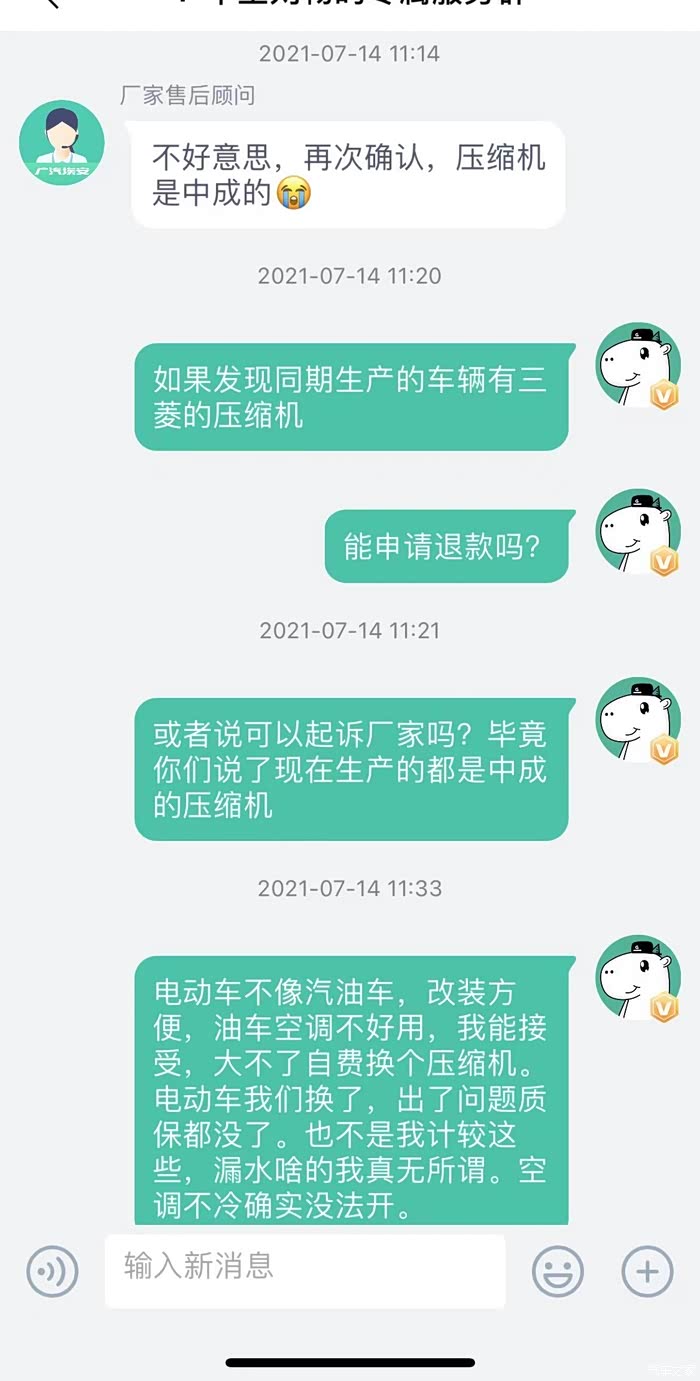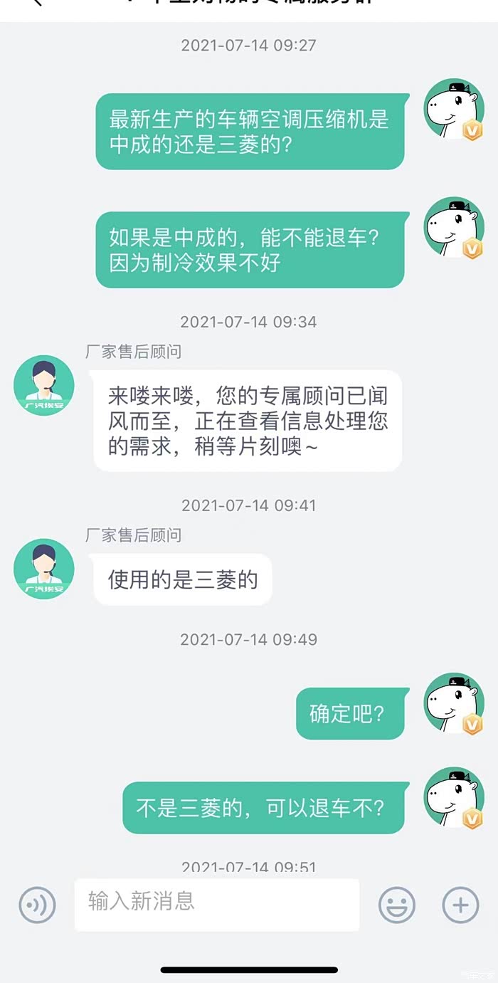 关于咨询的空调问题,客服给了我三次答案,7月14日上午有车友反映三菱的压缩机不存在制冷问题,于是我询问了客服,客服第一次说我的车辆使用的三菱压缩机,后面经过客服向相关生产部门咨询后再次答复为中成的压缩机,我的态度很明确,既然你们官方表示这一批生产的均为中成的压缩机,后期如果发现同一批存在三菱压缩机的,我要进行维权。另外如果中成压缩机使用中出现不制冷的问题,厂家应及时解决问题,毕竟是夏天,离开空调真的无法开车。没想到当天下午,客服主动联系我,告诉我这一批车辆经过再次确认之后使用的是三菱压缩机。我满心欢喜,才导致了后期提车的悲剧。经过漫长的等待,7月20日一早,4S店销售通知我,车辆到店。于是和姐夫一同驱车100公里的路程前往4S店提车,并在途中误操作点击了APP中确认收车的按钮(APP上面有需要支付的余额,在客服保证的前提下,本人在还未见到车辆的前提下误点了验收。)误触之后及时询问客服,收到的回答是没问题。