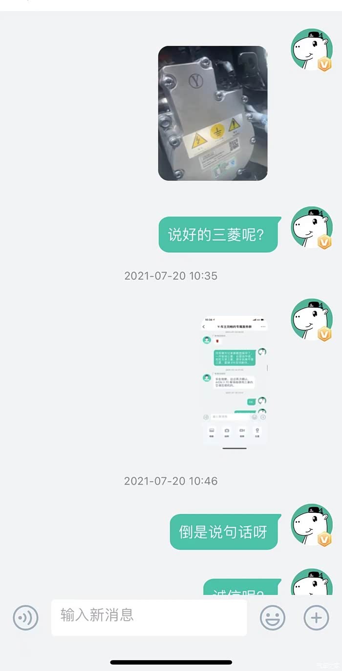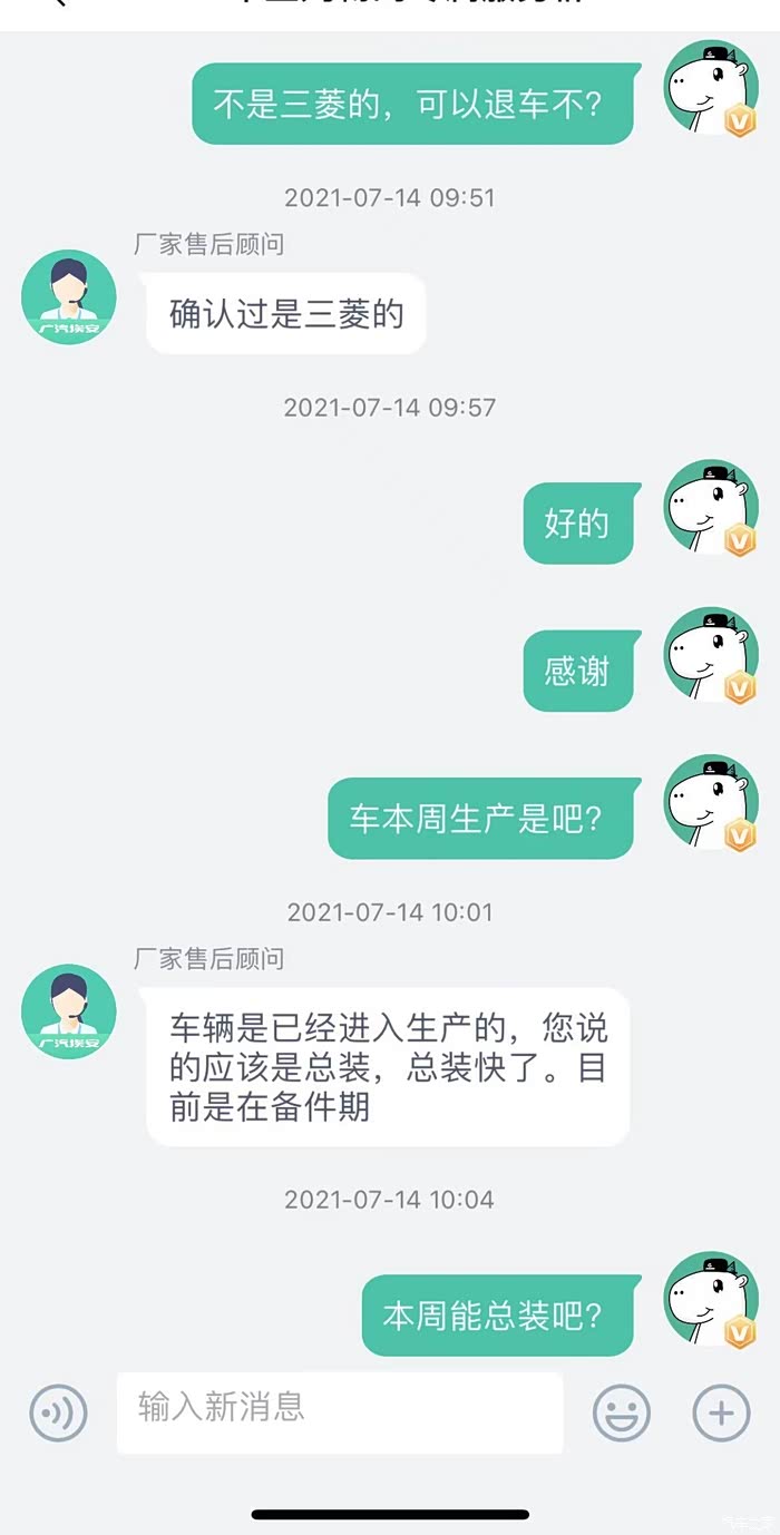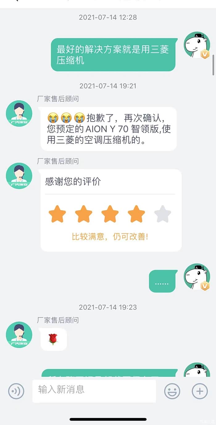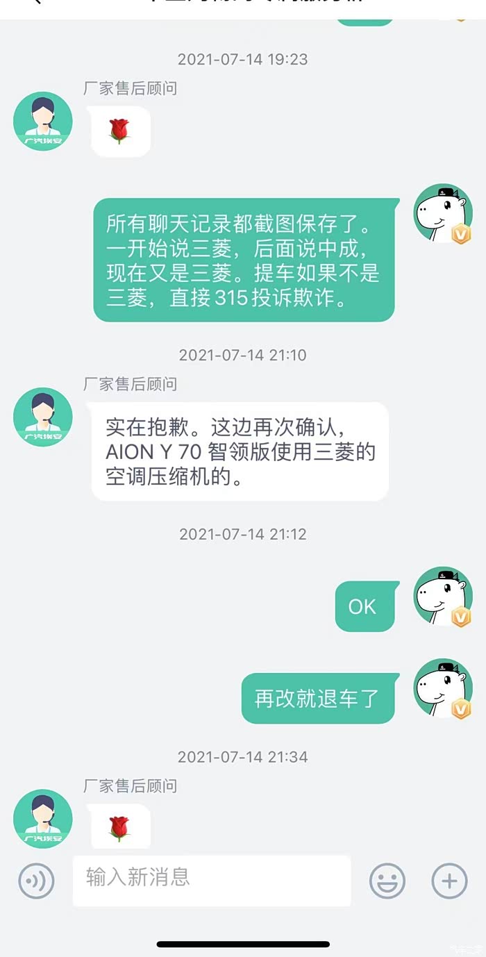 关于咨询的空调问题,客服给了我三次答案,7月14日上午有车友反映三菱的压缩机不存在制冷问题,于是我询问了客服,客服第一次说我的车辆使用的三菱压缩机,后面经过客服向相关生产部门咨询后再次答复为中成的压缩机,我的态度很明确,既然你们官方表示这一批生产的均为中成的压缩机,后期如果发现同一批存在三菱压缩机的,我要进行维权。另外如果中成压缩机使用中出现不制冷的问题,厂家应及时解决问题,毕竟是夏天,离开空调真的无法开车。没想到当天下午,客服主动联系我,告诉我这一批车辆经过再次确认之后使用的是三菱压缩机。我满心欢喜,才导致了后期提车的悲剧。经过漫长的等待,7月20日一早,4S店销售通知我,车辆到店。于是和姐夫一同驱车100公里的路程前往4S店提车,并在途中误操作点击了APP中确认收车的按钮(APP上面有需要支付的余额,在客服保证的前提下,本人在还未见到车辆的前提下误点了验收。)误触之后及时询问客服,收到的回答是没问题。