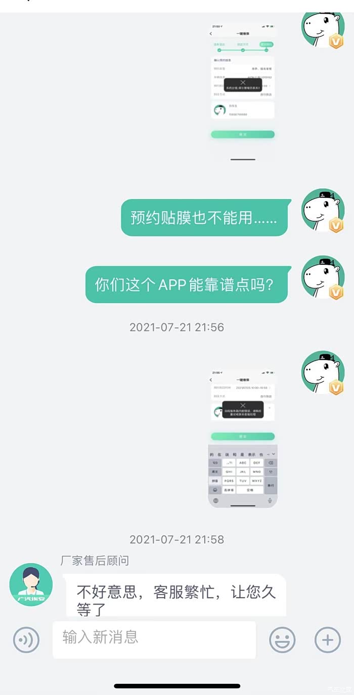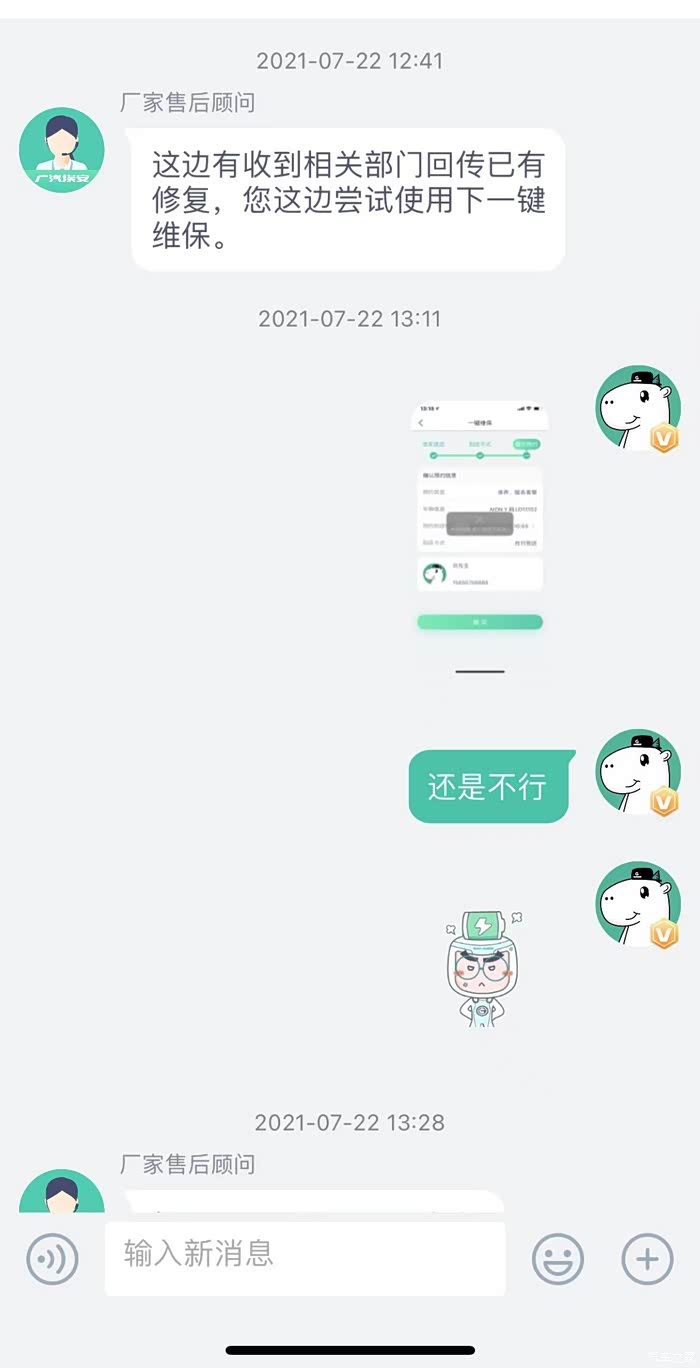联网功能解决以后,我已至车管所上牌,之前购买的服务小包终于可以预约贴膜了(确实太热了,空调问题也一直没有解决,只能尽快贴膜降温)在官方APP是用一键维保功能,多次预约均失败,反馈至客服。