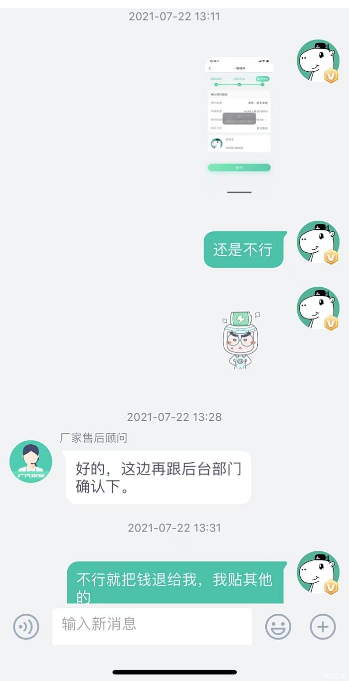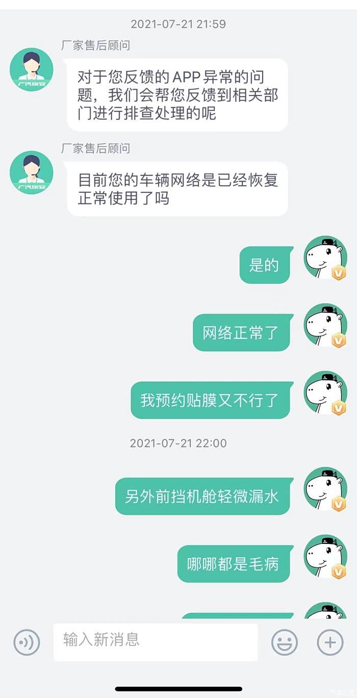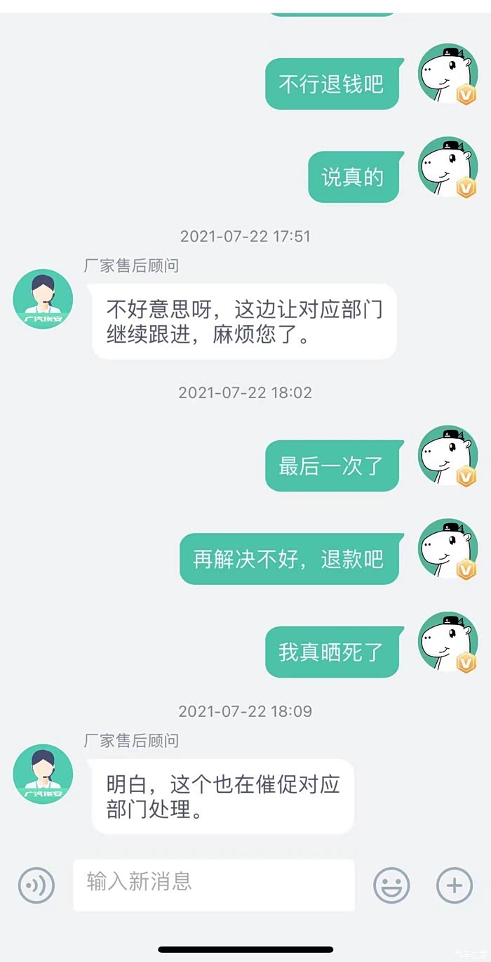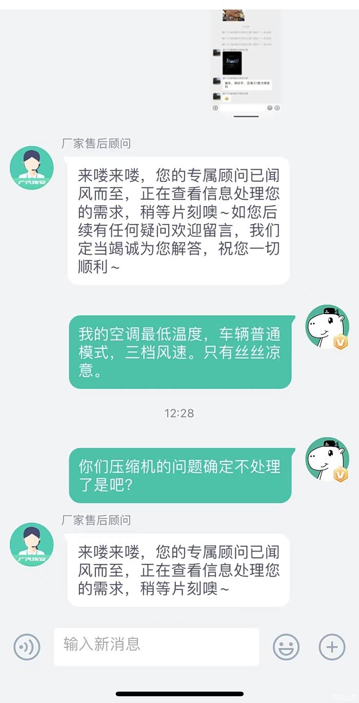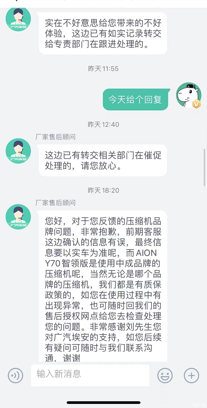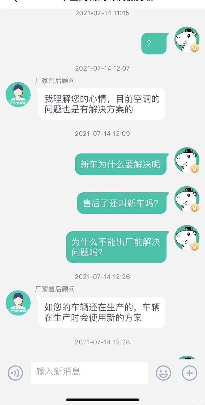 这是广汽埃安最后一次给我发的消息,之后反馈任何问题均不再搭理。消费者维权如此艰难吗?据我所知,不少准车主因为漏水以及空调的问题退车选择其他品牌,原本我也是其中一员,就是因为广汽埃安的客服承诺,我才会交钱提车(可能有的车主觉得这些都是小问题,我反应过激了,我想问问大家,钱是我的,东西我不喜欢,为什么不可以不买?每个人都有自己的需求,既然你们厂家保证没有问题,我才安心提车,提车以后又发生这样那样的问题,且厂家不愿解决,换做你们是不是很生气?)广汽埃安,劝你好好培训客服,劝你正视发生的问题并公正的解决问题,而不是直接不搭理(我们车友群里也有同样情况的车友)作为一个真实车主,再次呼吁广大准车主,考虑好一切可能发生的因素,这款车或这个品牌值得你们购买吗???