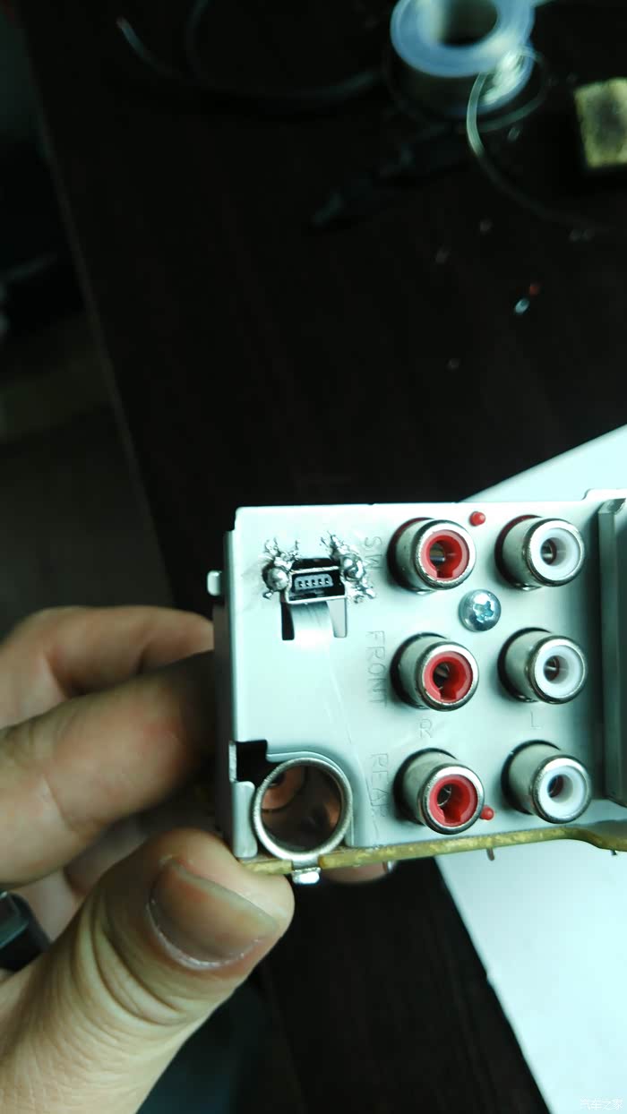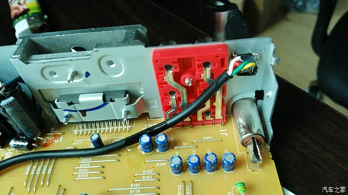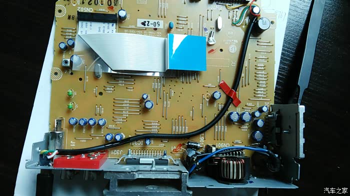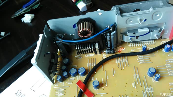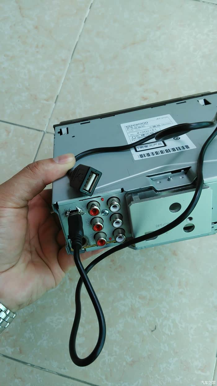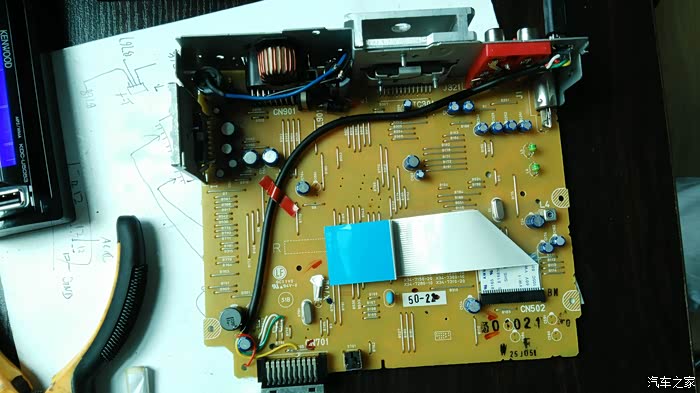 几年前不满意原车主机的音质,于是自己动手改了建伍U5053 CD机,此机是4x50W的mos功放管,带24BIT 的数模转换,解析力极高,音质极其细腻,听人声和乐器细节很不错,低音也还不错,就大音量大动态下后劲稍显不足。另外有个确定就是只有前置USB,插上U盘总有点别扭,前两天闲来无事想想把USB加一个后置的USB口,顺便加个电容(一般车载主机都是3300UF的电容),如果有运放芯片也顺便升级更高级的,说干就干,拆机这些很简单就不细说了,三下五除二就拆开了,拆开一看,除了几块芯片不错,其他设计还是比较简陋的,居然没有运放芯片,还好电容用的ELNA蓝袍电容,主滤波是ELNA16V3300UF,这个就是大音量大动态下后劲不足的元凶,正好手头也有同规格电容,也就不改什么10000UF的了,直接并联一个足够了,后面经过试听大音量下低音改善明显,后劲十足。USB口可以简单的直接焊接一根线从后面穿出,不过那个也不方便以后的拆装,我选择了在后面面板上加一个MINIUSB插座,配合自制的线把USB接口放到手套箱内,方便以后拆卸和隐藏U盘。下面看图: