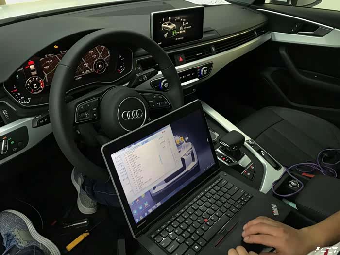最后说一下我是在上海工作但是车是在杭州买的,因为奥迪在全国有区域保护,在上海买的话就必须上沪牌,要么花10多万买张上海牌照,要么就上个沪C,但是沪C在上海太恶心了,外环以内任何时间段都不能进去,都比不上外地牌照,所以最后就直接到杭州买了。好了,下面就给大家看看提车之后的改装作业吧!因为要刷S4的运动布局,而且要在新车100公里之内才能刷,所以提车当天就从上海带了一个师傅直接到杭州4S店去刷