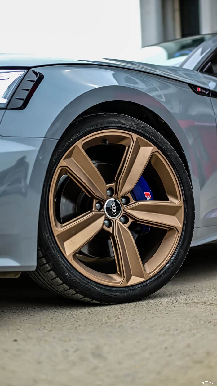 侧面部分,A5老大哥选择了古铜色的大保健轮毂,我个人感觉古铜色是一种个人性格的表现,有的人喜欢有的人可能觉得有点老气,但搭配上A5这天云灰的车衣配色,真是绝了!