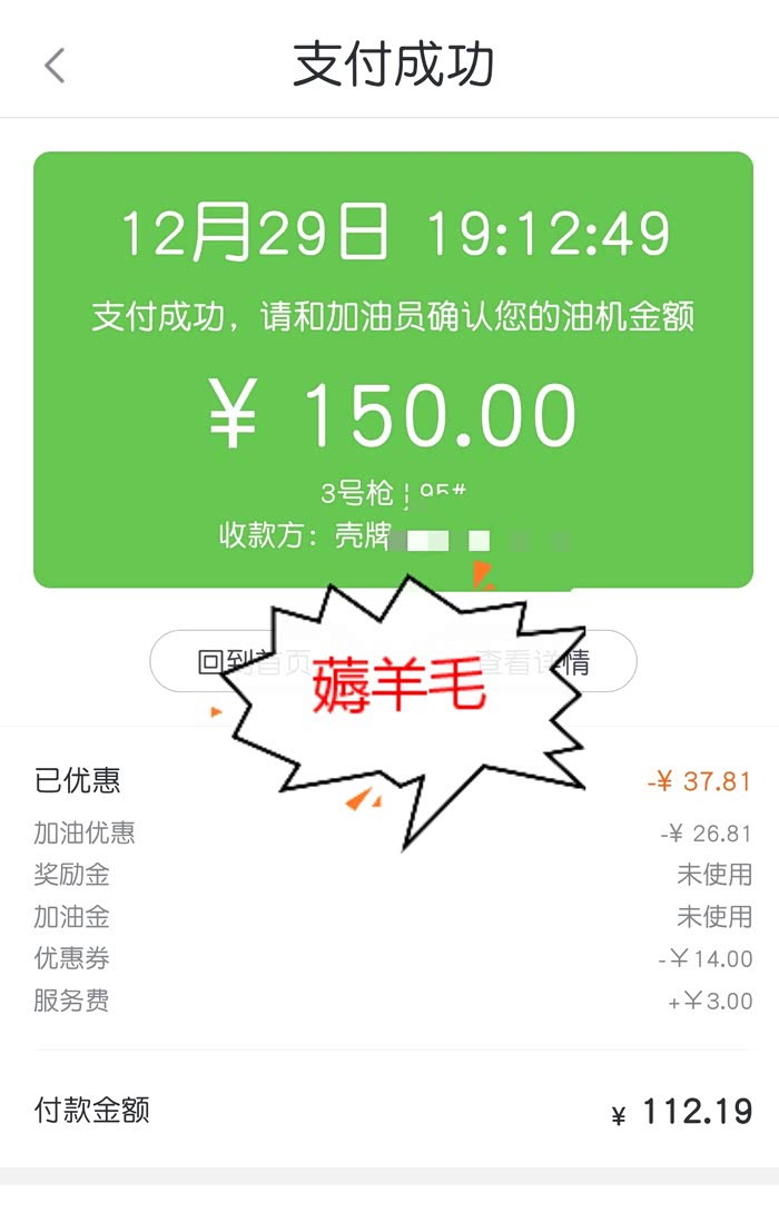 铛铛铛! 加油150元,优惠差不多38元,相当于优惠了25%!好开心