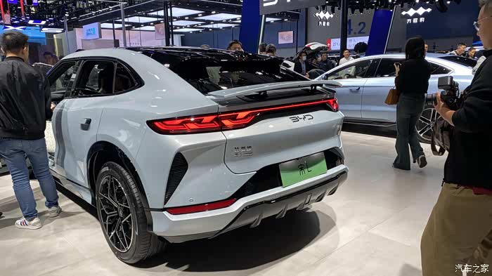 来到车身侧面,就很容易看到宋L拥有低趴的车身姿态,下溜式的车顶线条让它的车尾部分看上去十分紧凑,车顶直接延伸一根尾翼出来,增强运动感,车身侧面多条腰线勾勒,增强整车的力量感,同时搭配五星轮毂,有点轿跑的感觉