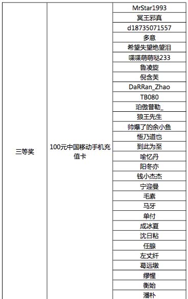 三等奖 30人:中国移动手机充值卡一张,价值100元