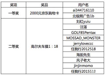 二等奖 10人:高尔夫车模(1:18)1个,价值400元