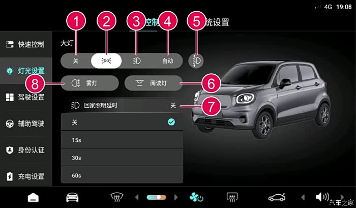 T03总体的灯光控制在车机车辆控制,灯光控制中进行控制。其中所有数字表示的意义分别是。1.灯光关闭,2.位置灯开关,3.近光灯开关,4.灯光自动开关,5.大灯高度调节,6.阅读等开关,7照我回家,8.后雾灯开关。