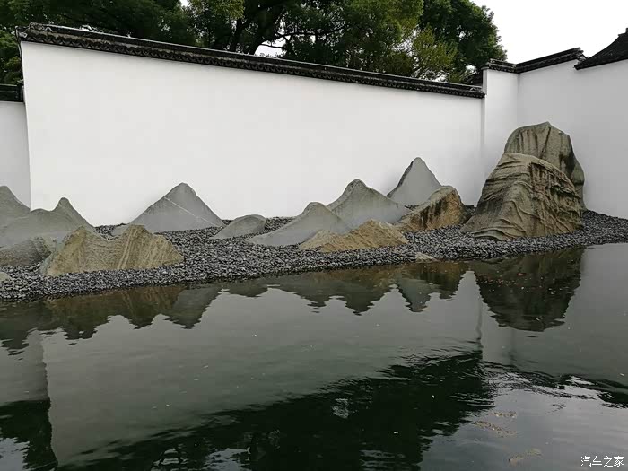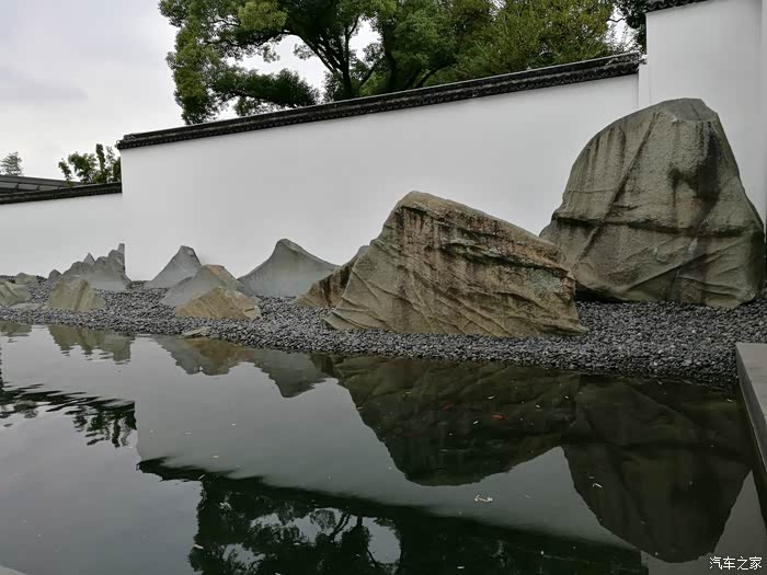 石材贴片替代了传统的奇石,碎石的坡度和水面的倒影以及背景的留白完完全全就是布置了一幅实景水墨画,真是高明!