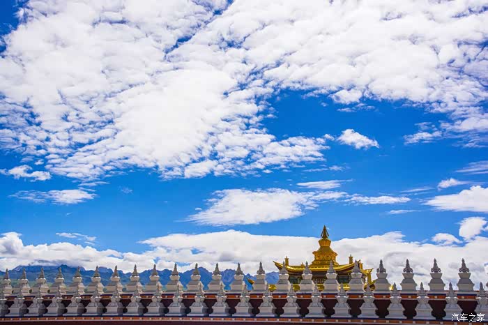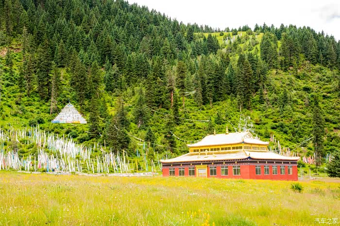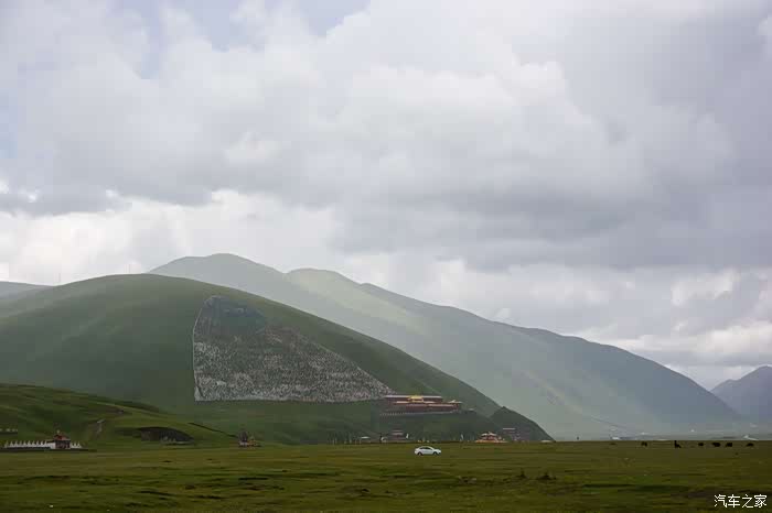 途经龙灯草原,当年格萨尔王曾在龙灯大草原安营扎寨。远处是一座红教寺庙然姑寺