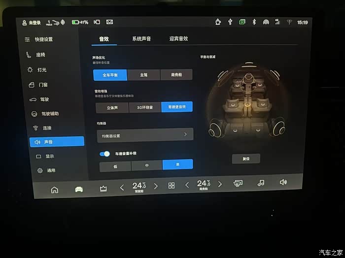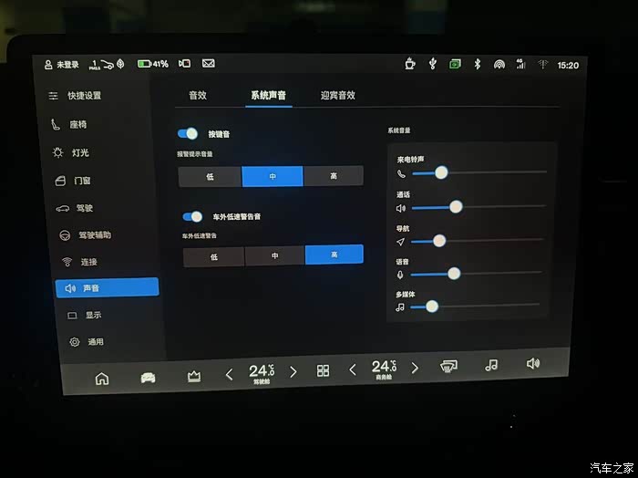 声音界面,按需设置,建议车外低速警报音调到高,更有助于提醒行人安全避让。