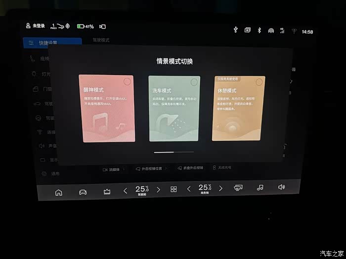 中控屏下拉可以出现这个界面,可以进行个性化设置,以及情景模式下,洗车模式等选择。中控屏顶部的小图标均可点击打开查看。车辆自带网络传输,可以设置车载热点,乘客都可以加入无线网方便实用。