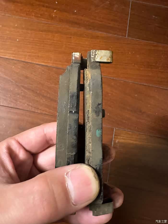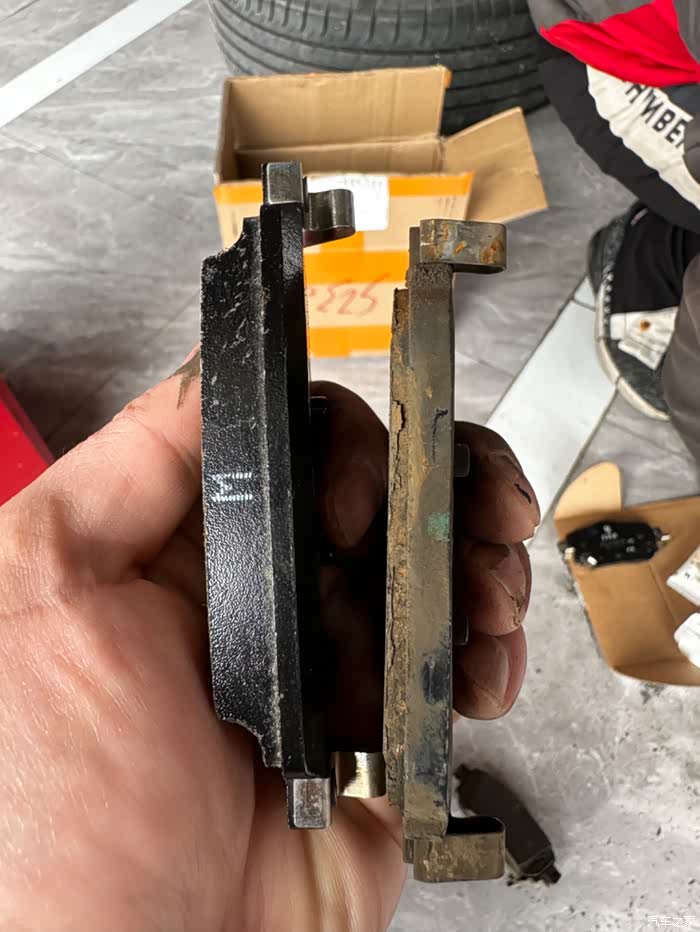 最后说一下 为什么4W公里 后刹车片会磨的这么厉害,上面换下来的一组两片,大家可以明显看到,一边磨的厉害, 一边还有多,这个问题我也去查了下,感觉应该就是刹车分泵销没有正确回位,所以偏向了一边,这样的话需要重新上润滑,让他正确回位,想想刚才盯着师傅上润滑脂还是很重要的。总之,这次换刹车片非常的完美,效果也很好。自己也学了许多知识。