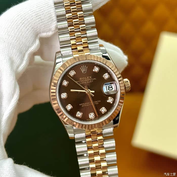 表壳和表耳两侧都散发出淡雅光泽,让31毫米的蚝式表壳更显突出。太阳光线效果的巧克力色表盘搭配钻刻时标,奢华中透着优雅。