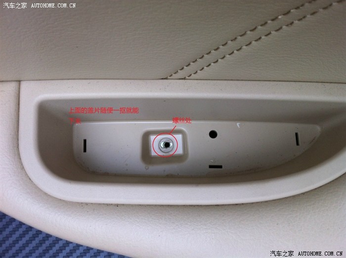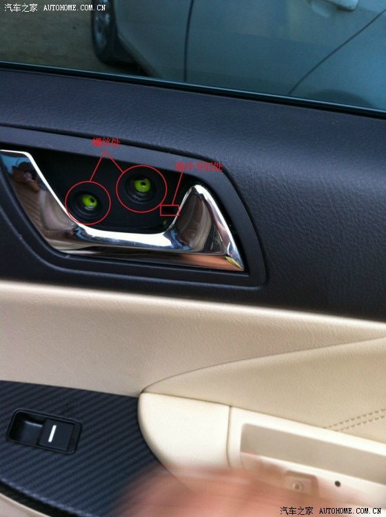 然后注意拆门板的时候,注意卡扣别弄断了,悠着点。红色实心的地方是钻眼的地方,这是后门的,前门的地方在车门靠右侧。