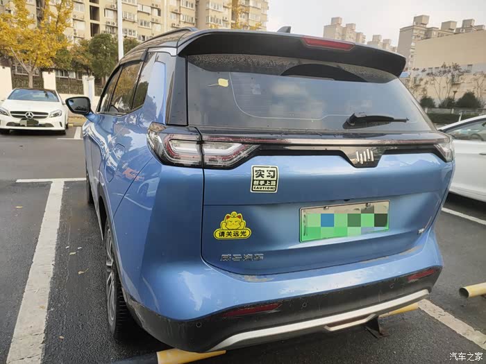 车子后面的照片是这样,贯穿尾灯非常漂亮,一条红色的横条搭配流水转向灯,最下方还有红色雾灯,非常有辨识度和科技感。