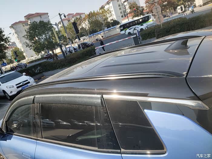 悬浮式设计的黑色车顶,后面是鲨鱼鳍样设计,应该是天线。